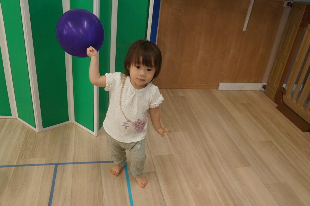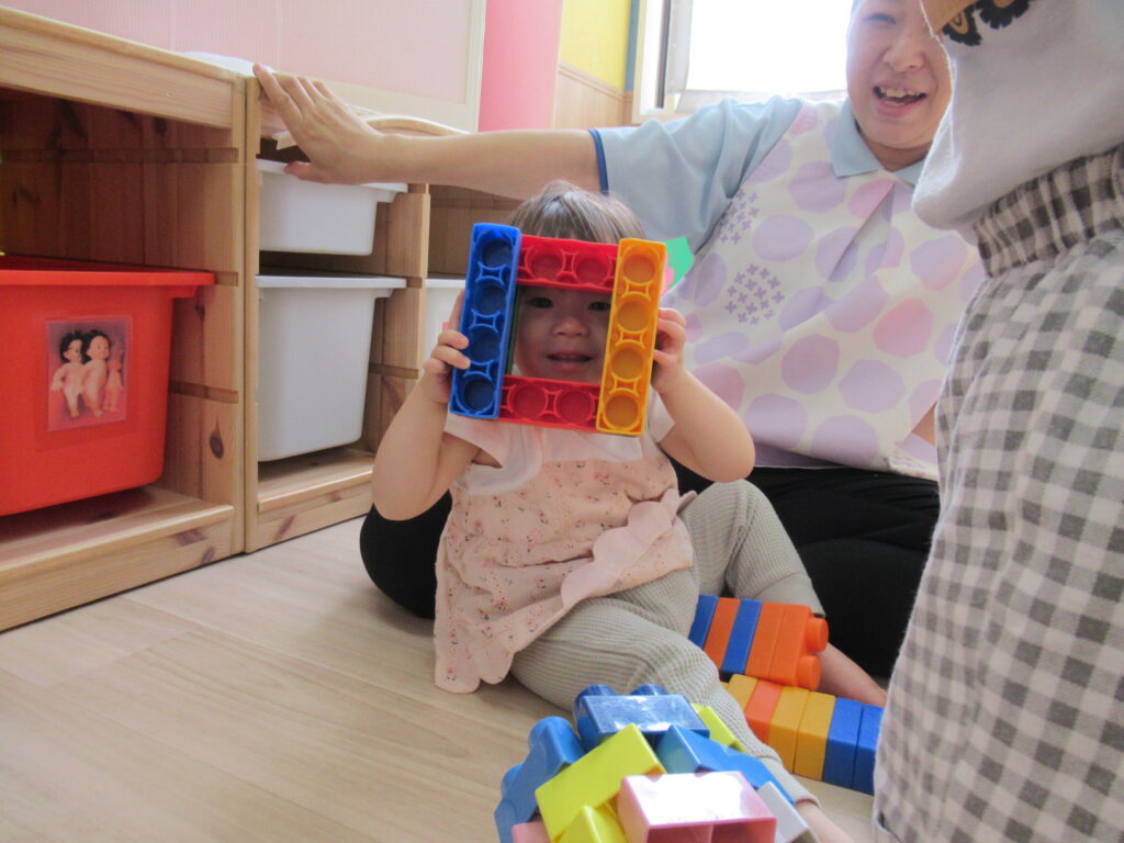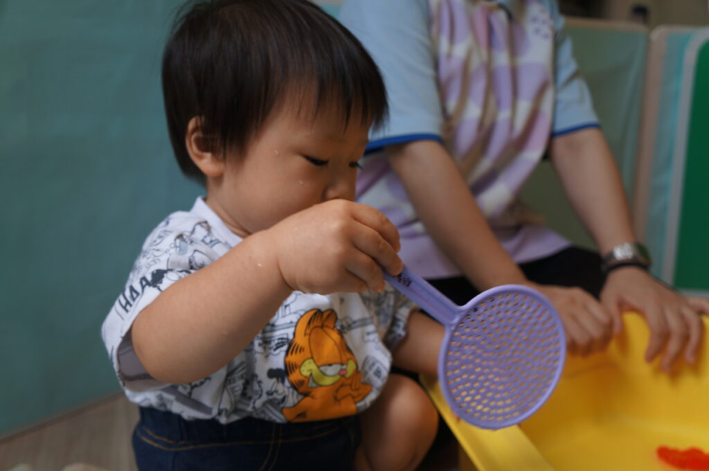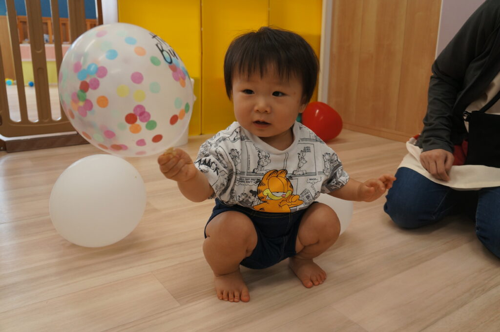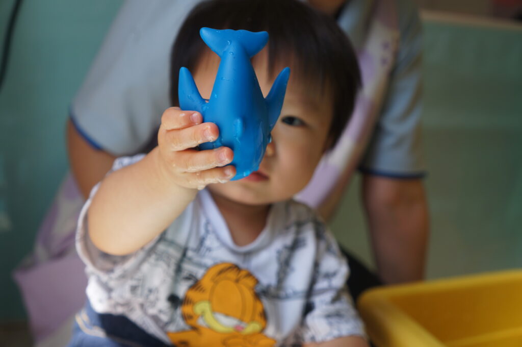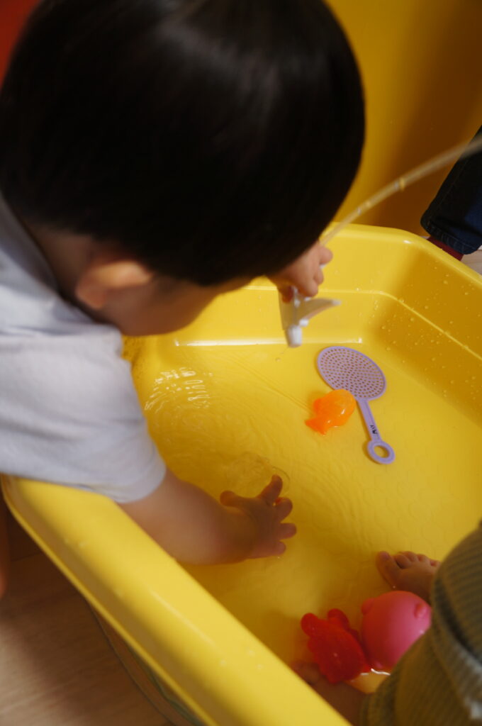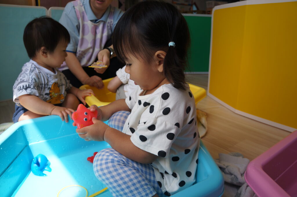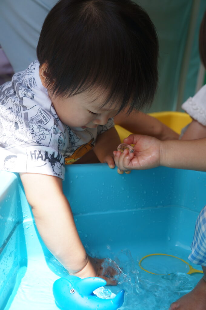 0、1歳児は、室内で水に触れてあそびました。