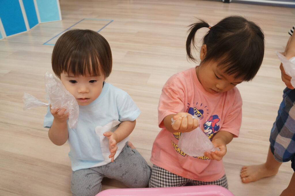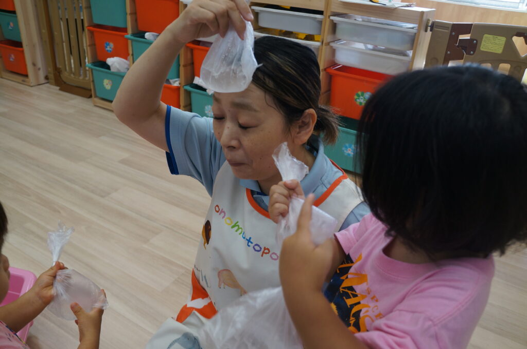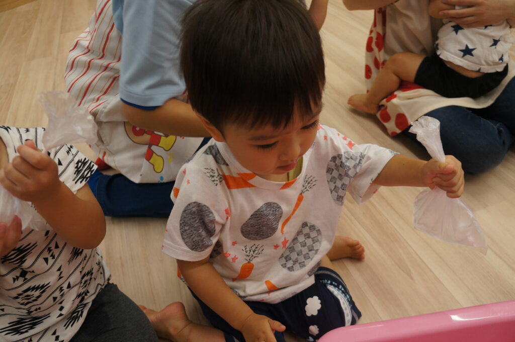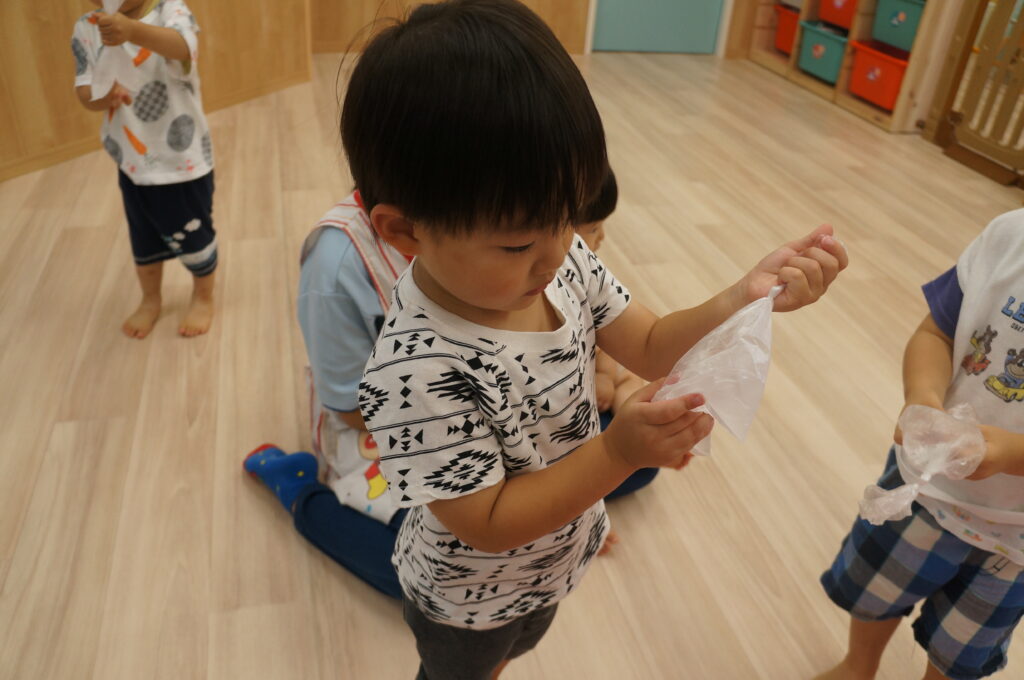 袋に氷を入れて、みんなで触って「つめたい」あそび♪