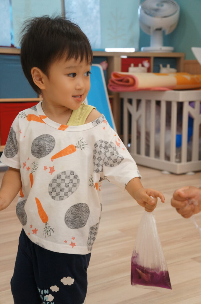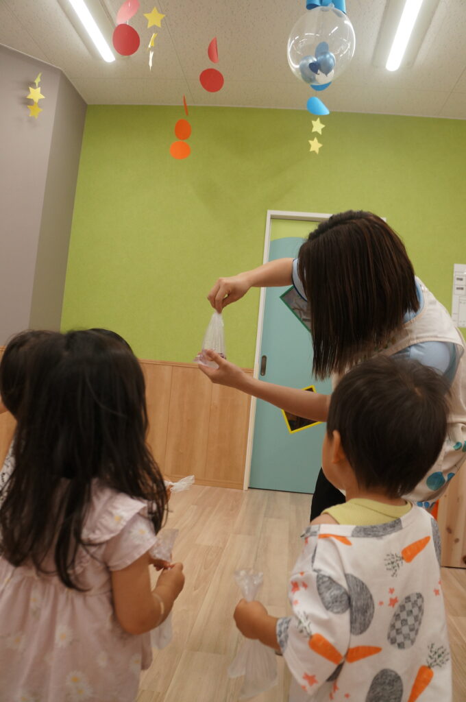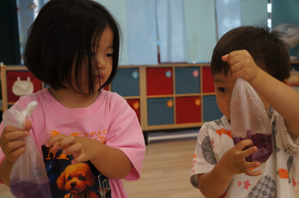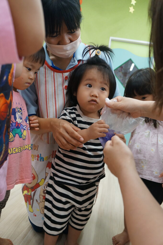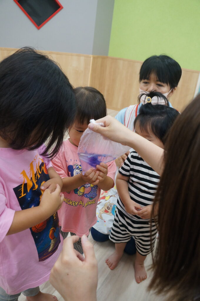 袋に氷を入れて、みんなで触って「つめたい」あそび♪