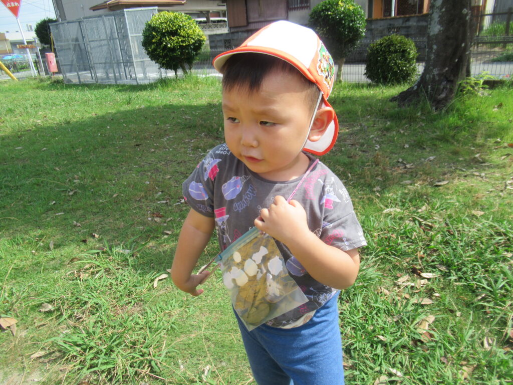 おさんぽバッグに、うれしそうに葉っぱや小枝を入れていました。