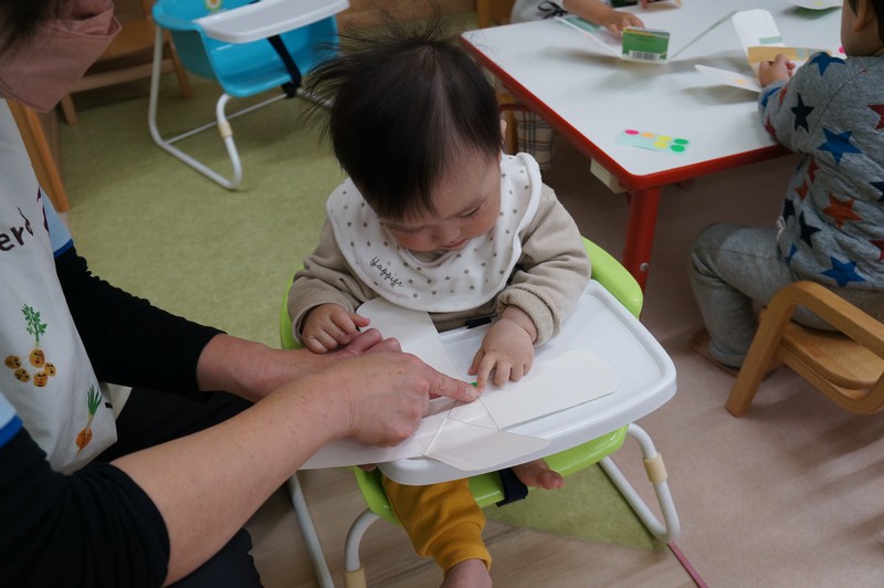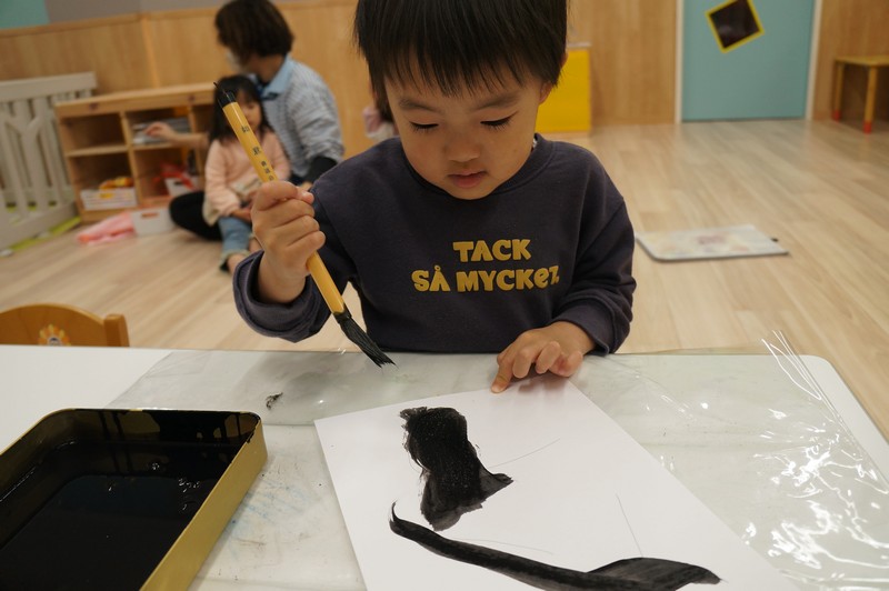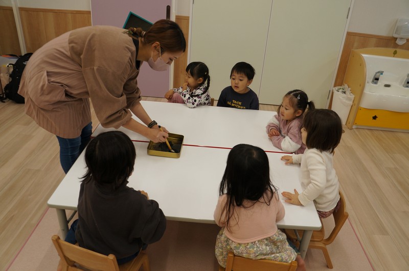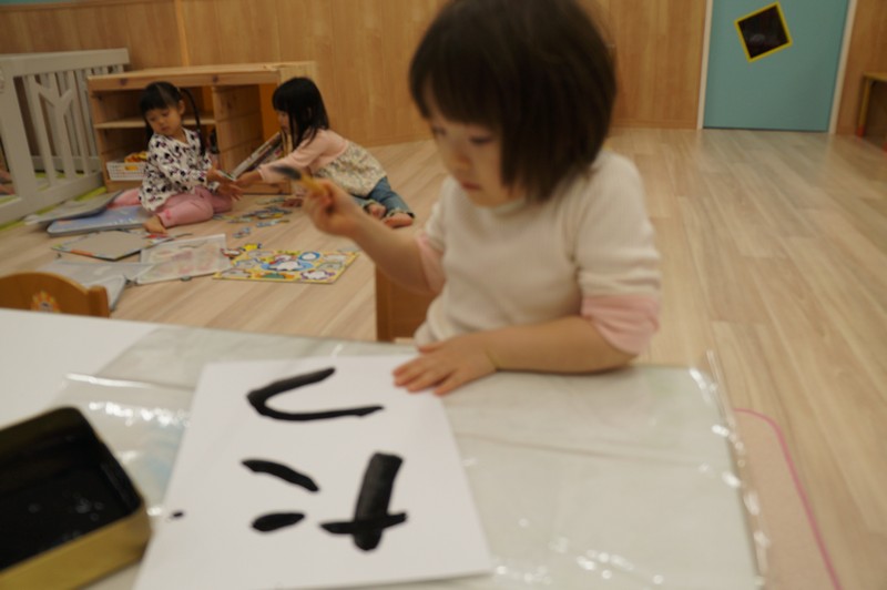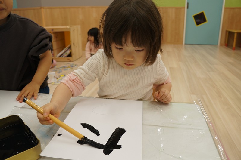 2歳児クラスは、書き初めを…。