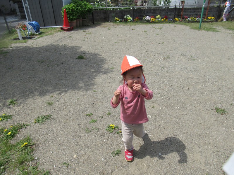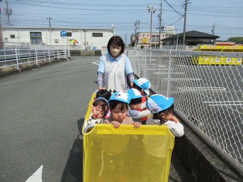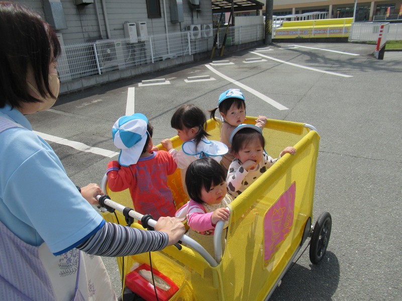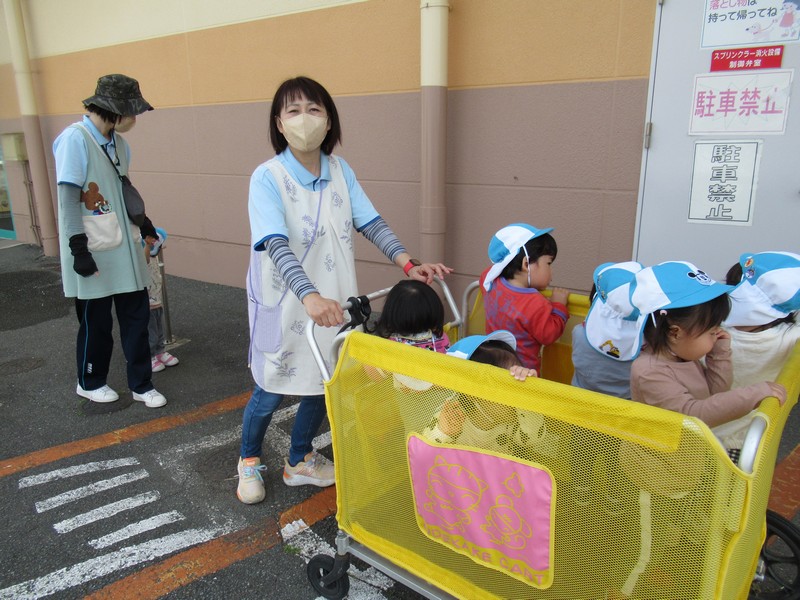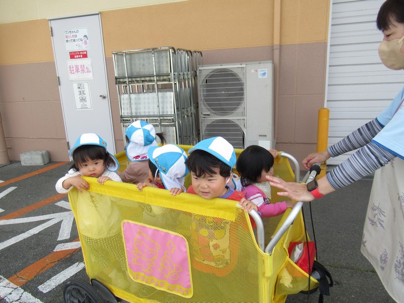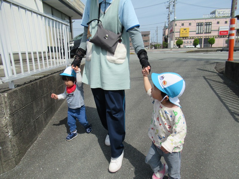 0、1歳児クラスは、保育園の周りをおさんぽ。