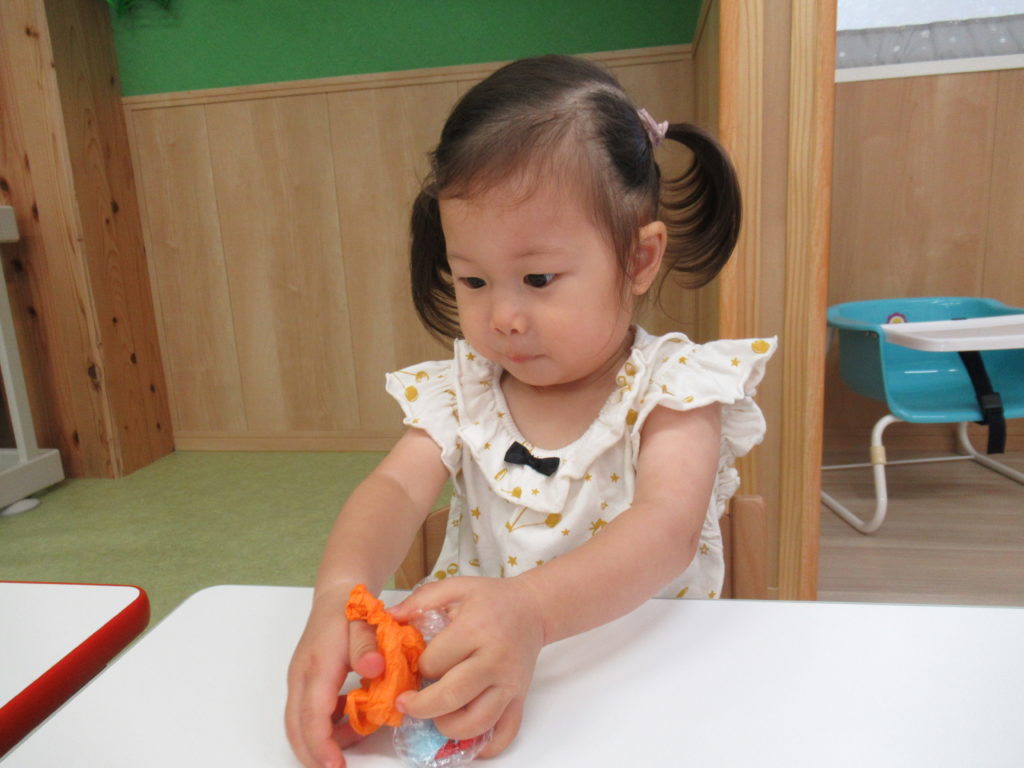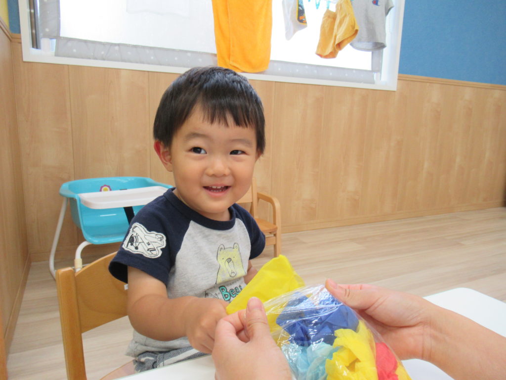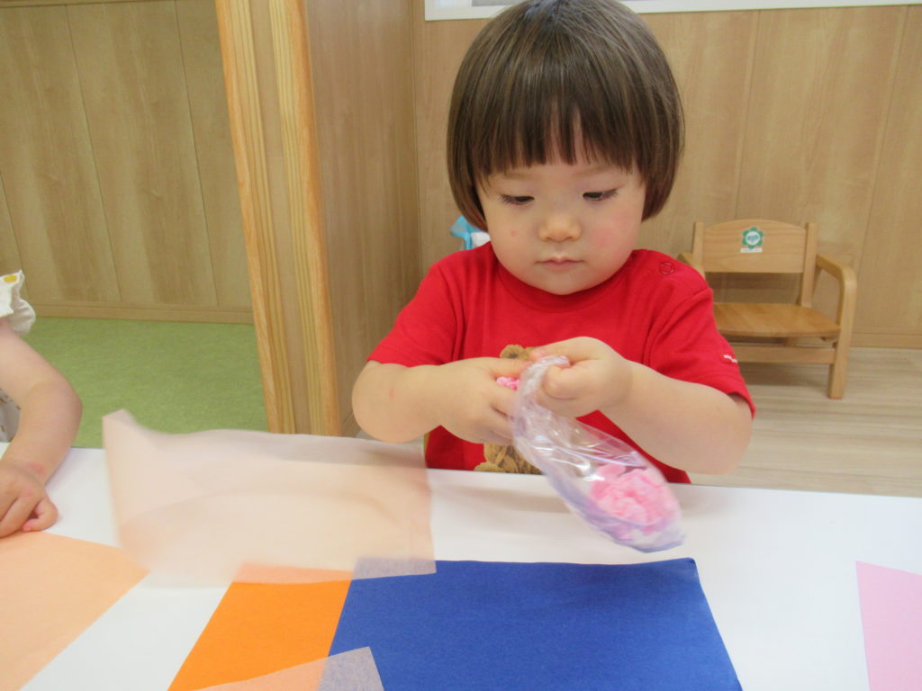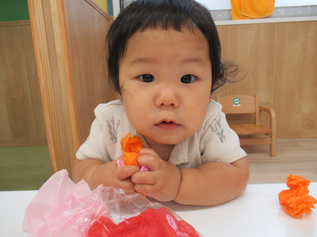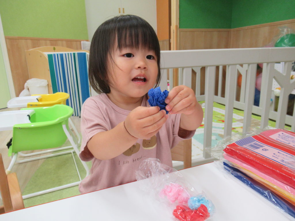 7月の壁面は「海の中」。2歳児さんは「カニ」、1歳児さんは「おさかな」、0歳児さんは「カメ」を作成しました。涼しげでいいですね。今日は別のおさかなを制作しました。色とりどりのお花紙をくしゅくしゅしてビニールにイン。夏まつりに登場します。