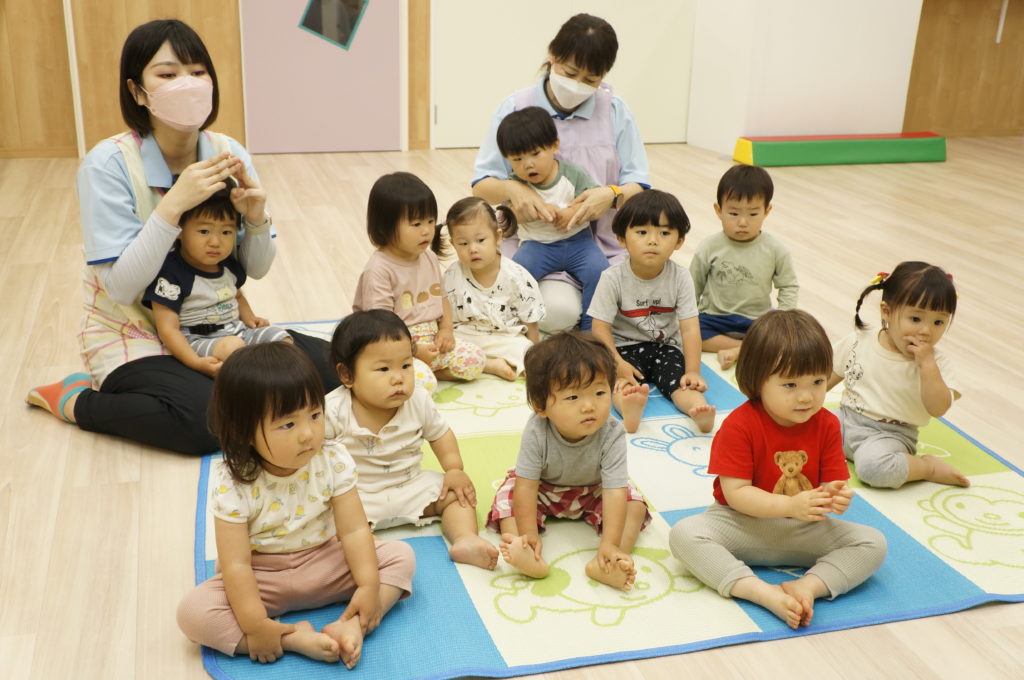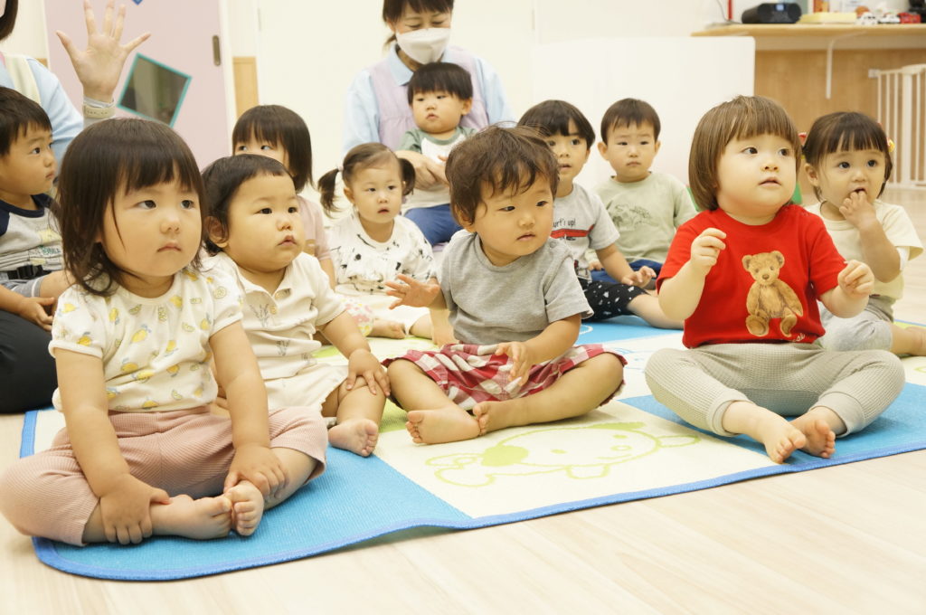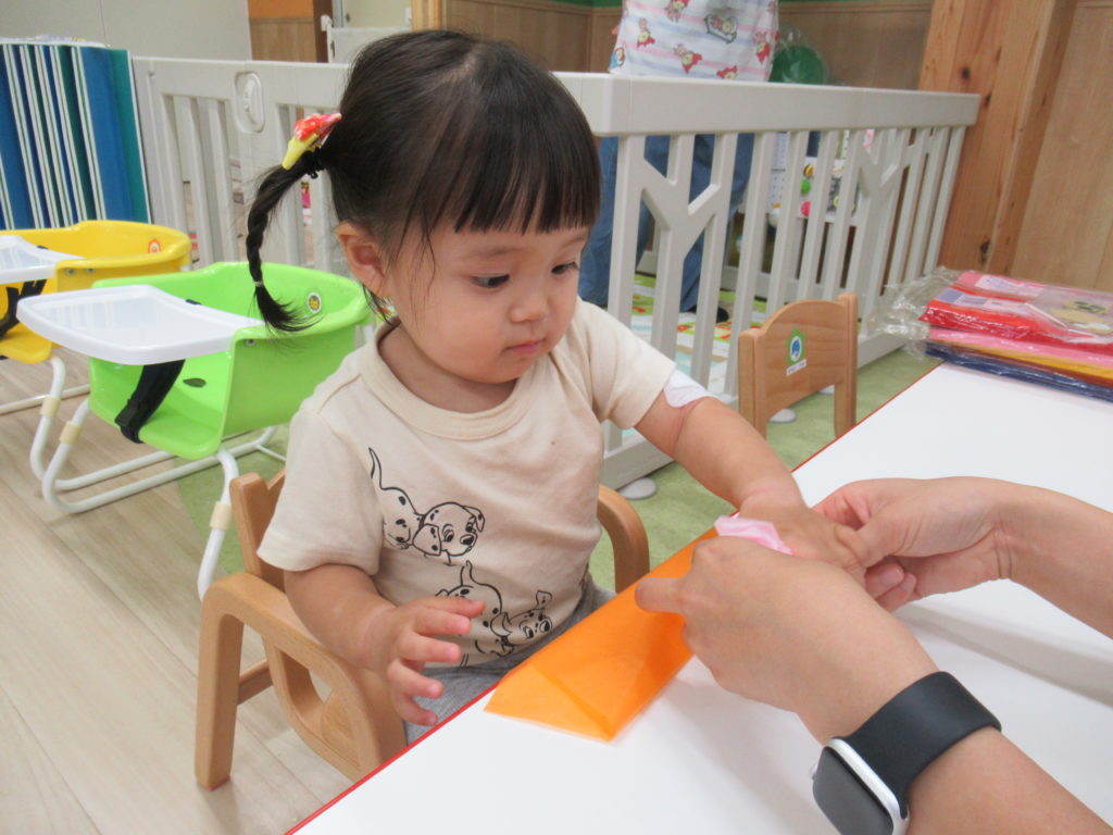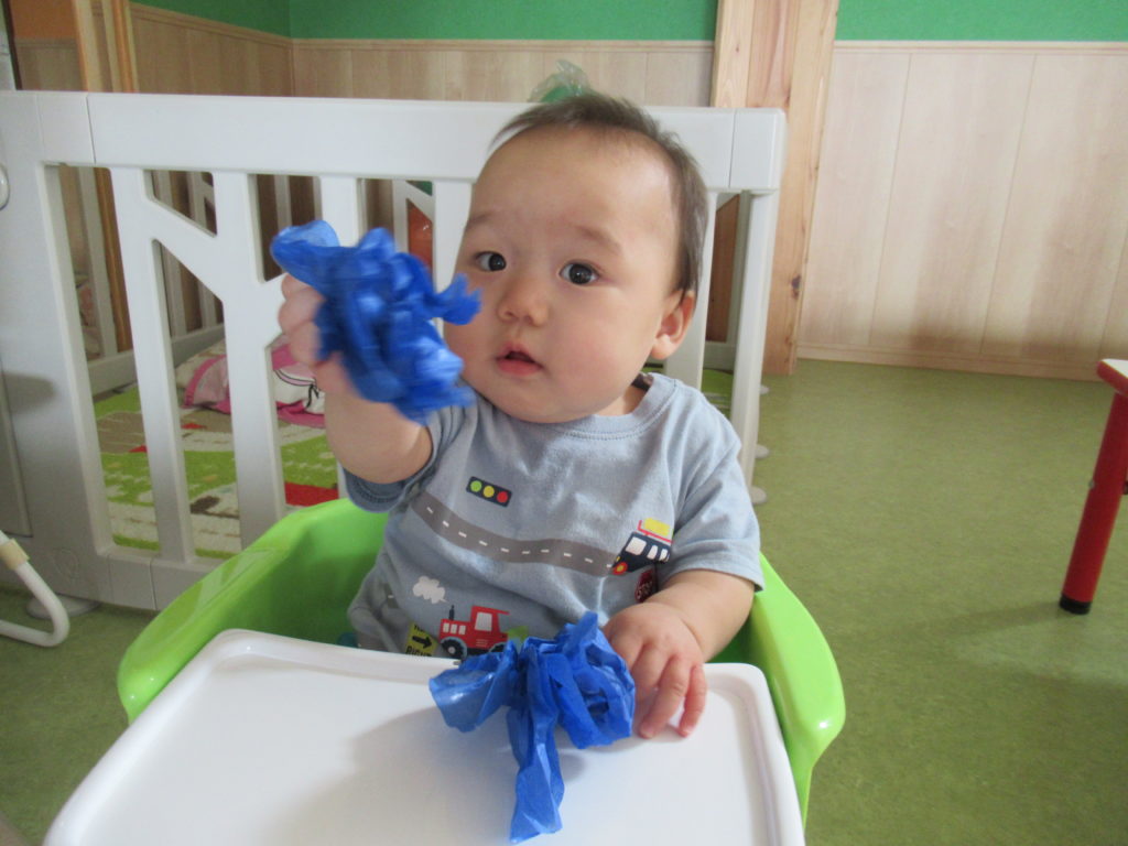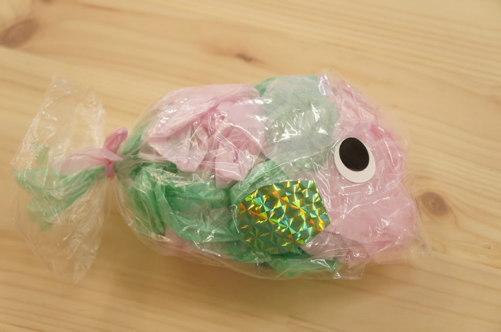 7月の壁面は「海の中」。2歳児さんは「カニ」、1歳児さんは「おさかな」、0歳児さんは「カメ」を作成しました。涼しげでいいですね。今日は別のおさかなを制作しました。色とりどりのお花紙をくしゅくしゅしてビニールにイン。夏まつりに登場します。