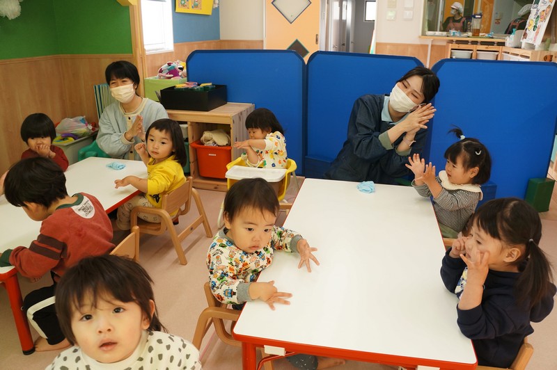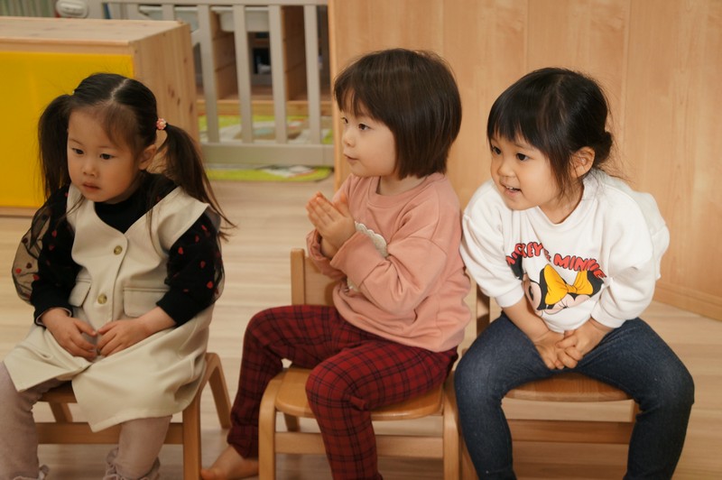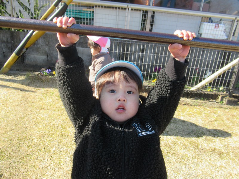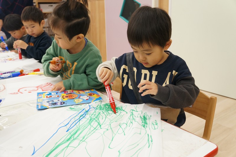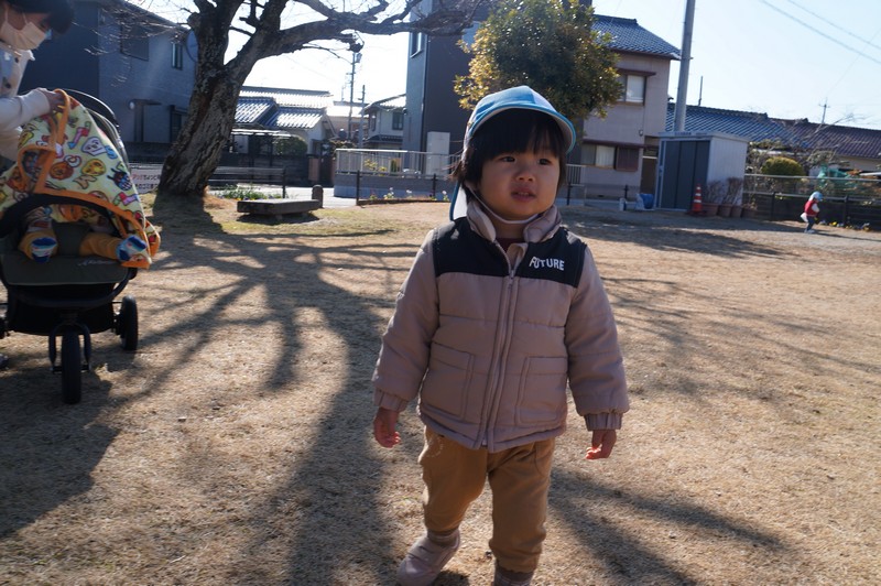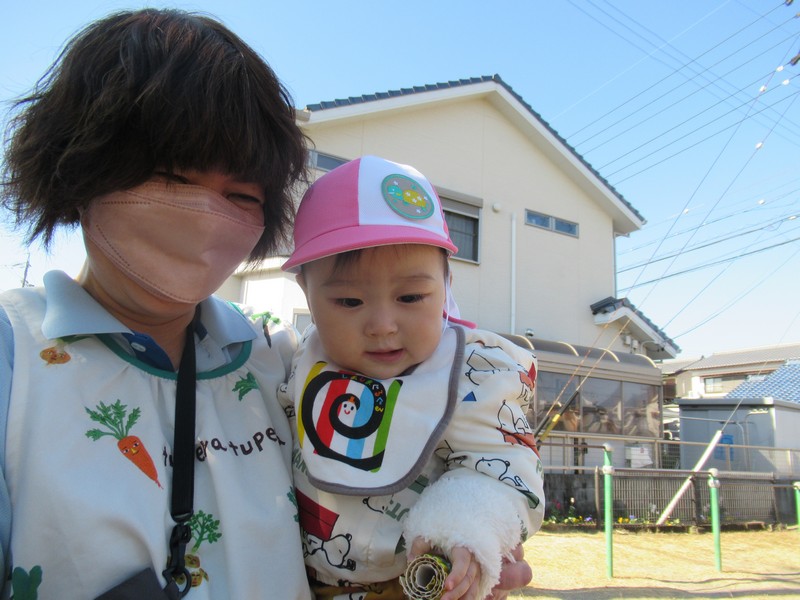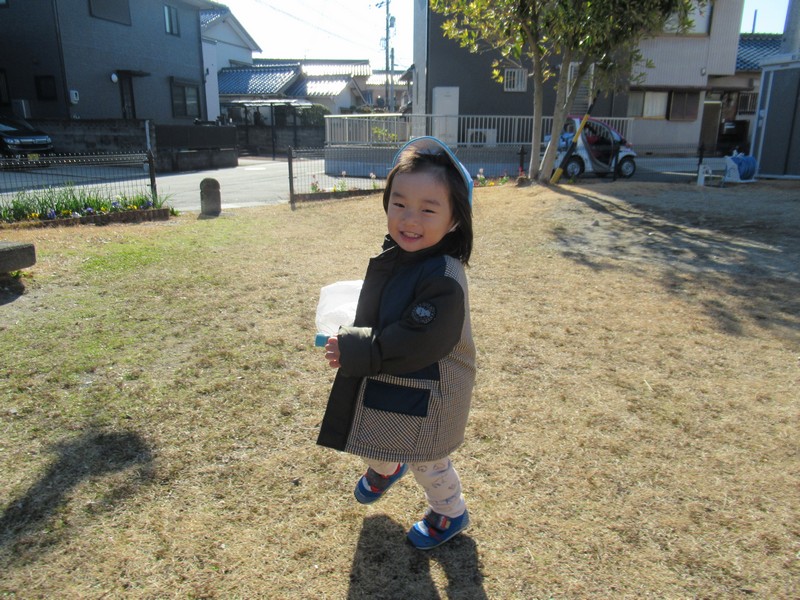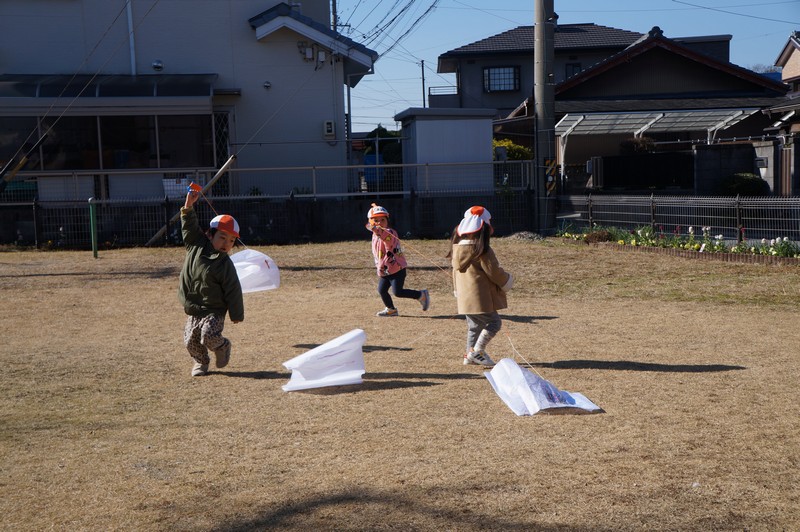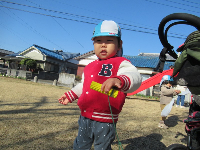 2歳児クラスは、自分たちで絵を描いた凧をもってお散歩に行きました。