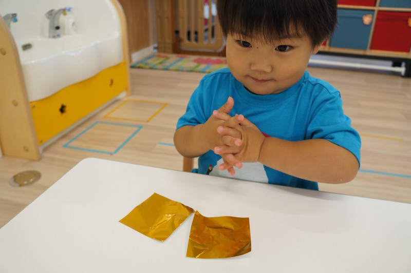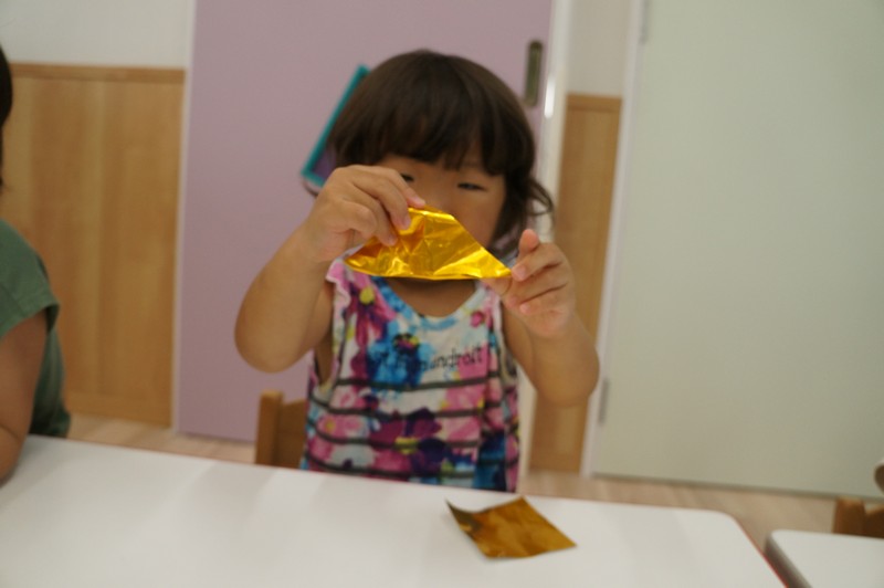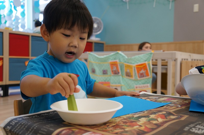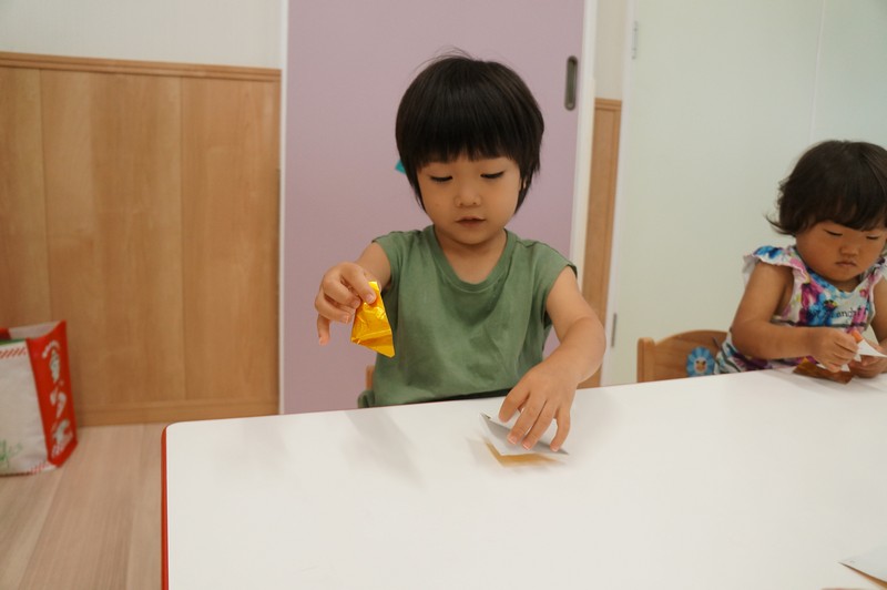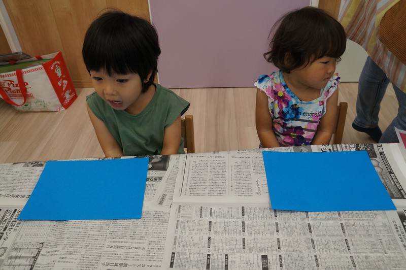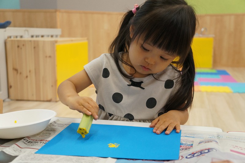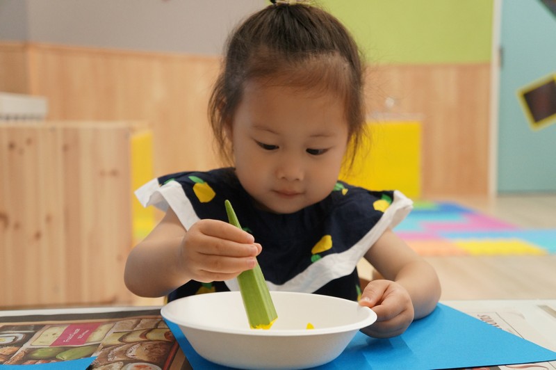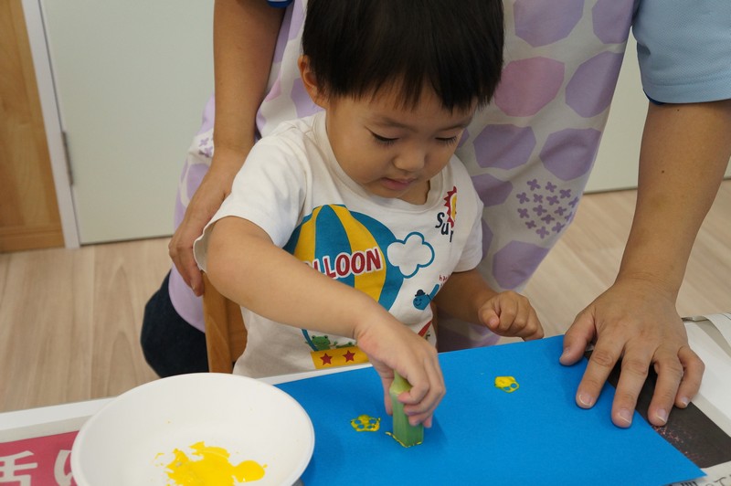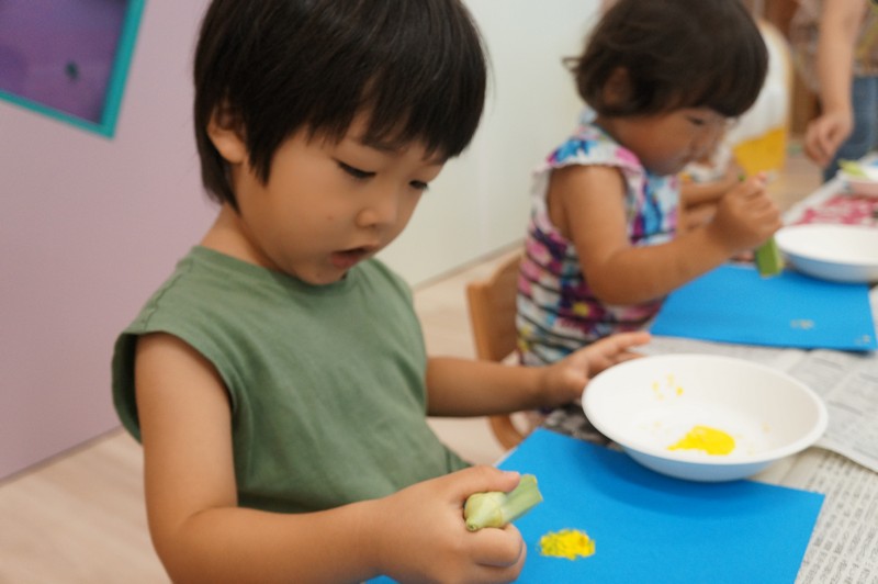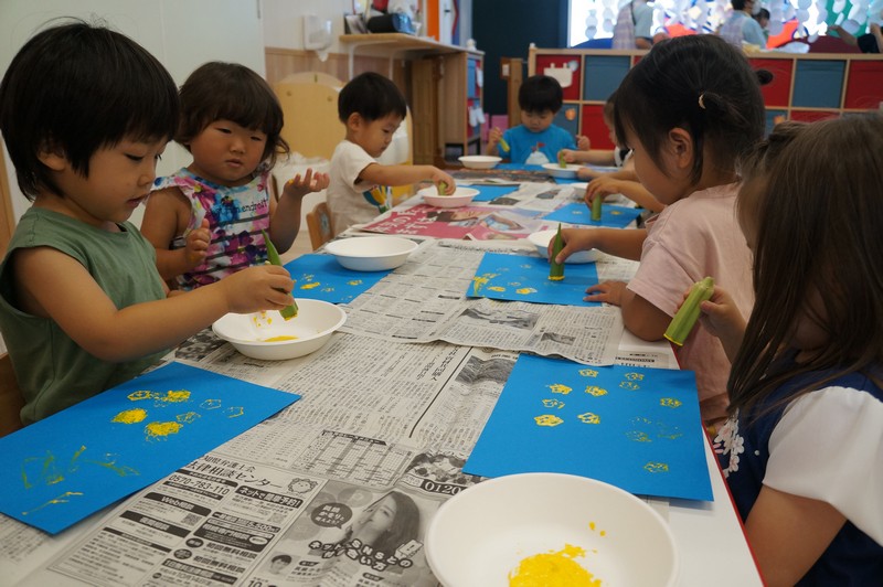 2歳児クラスは、育てたオクラで…スタンプ♪