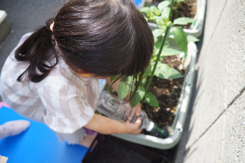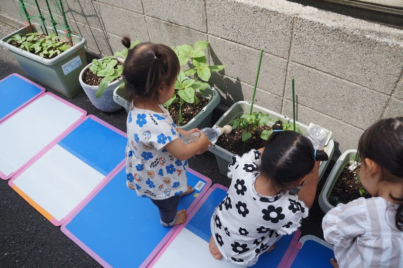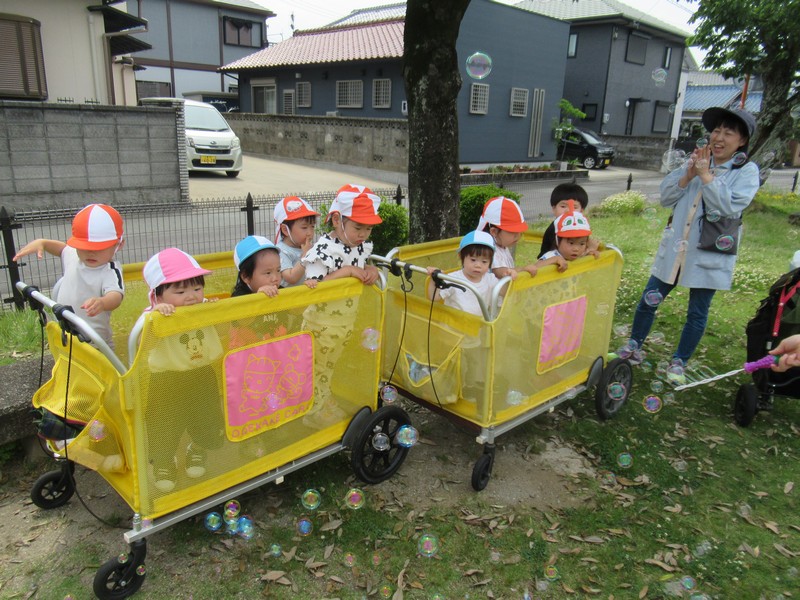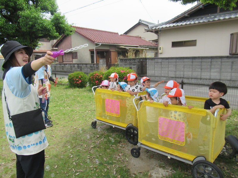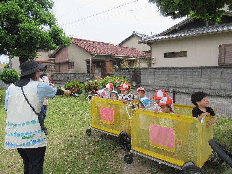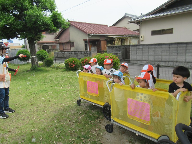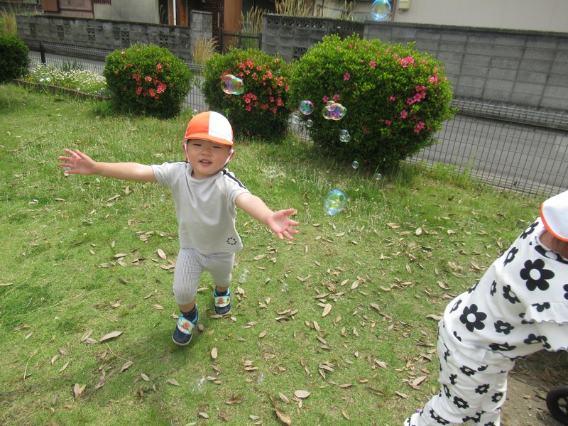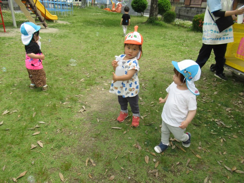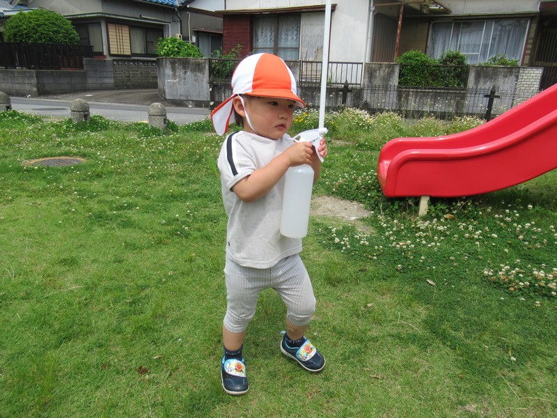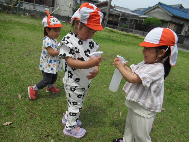 しゃぼん玉を追いかけたあとは、霧吹きで遊びました。
