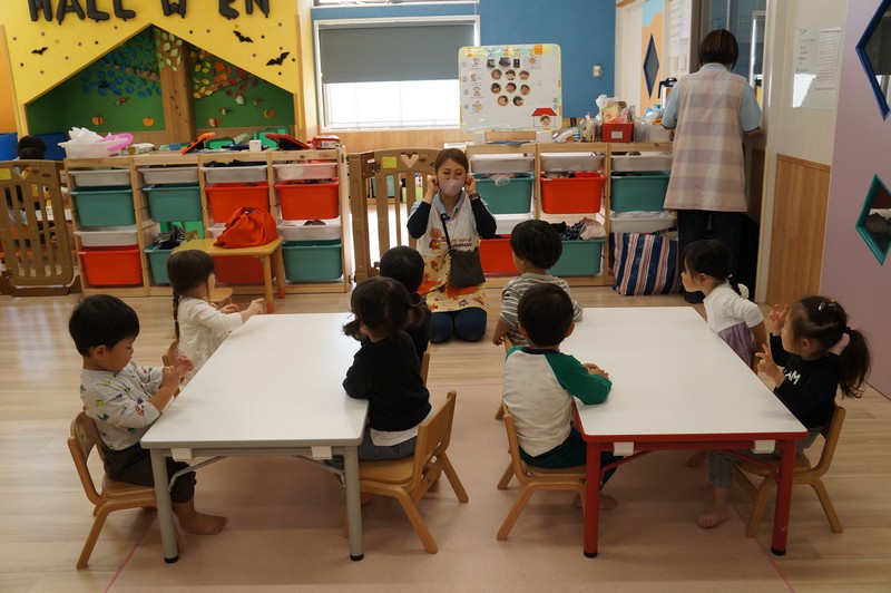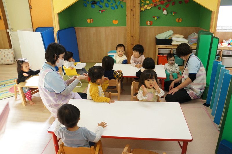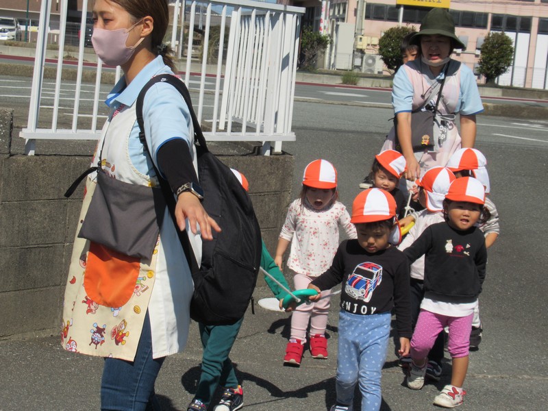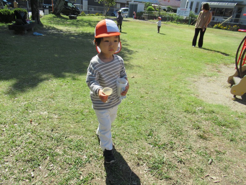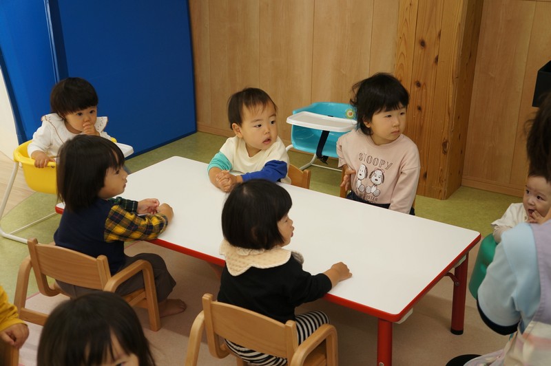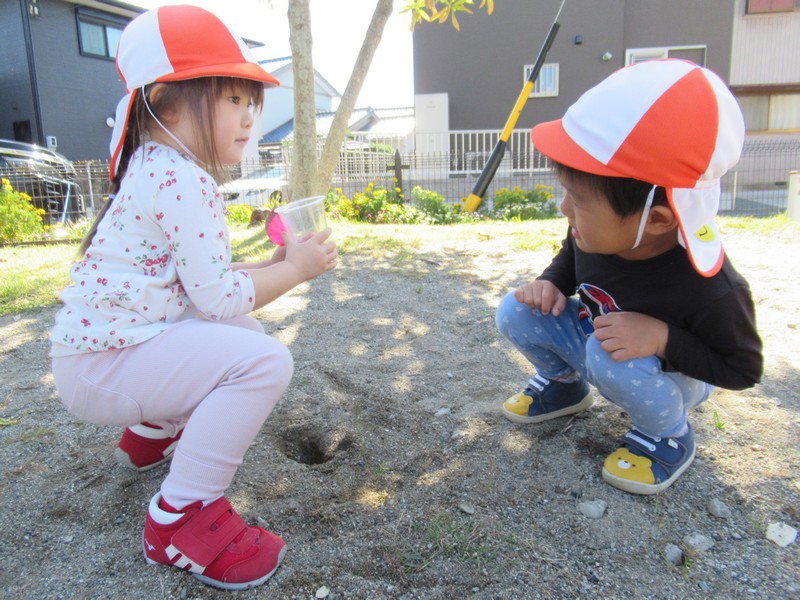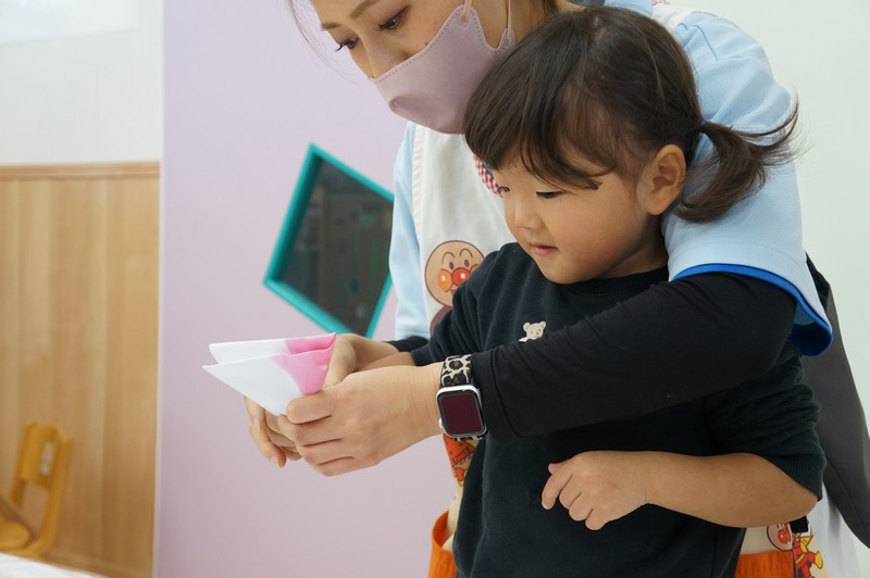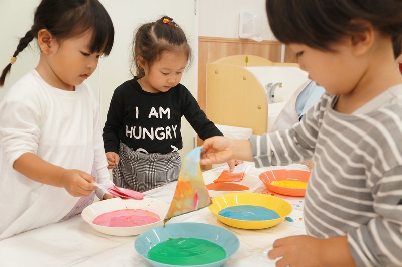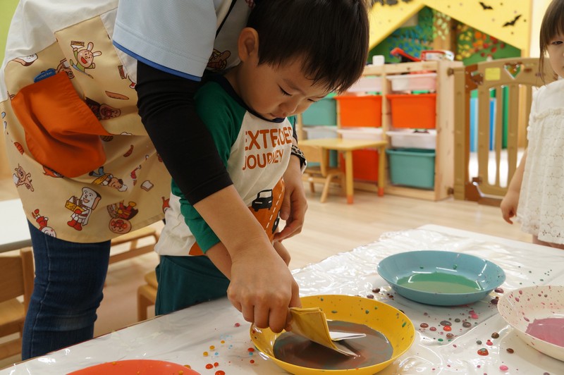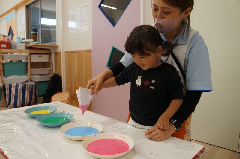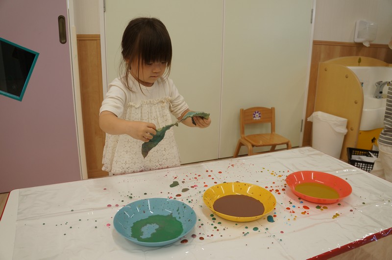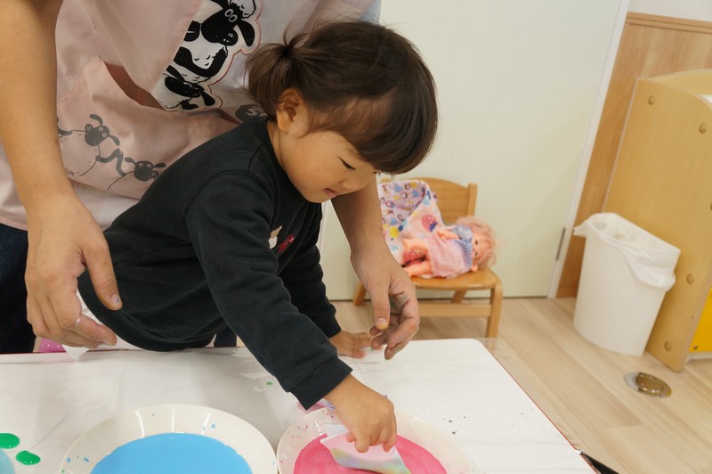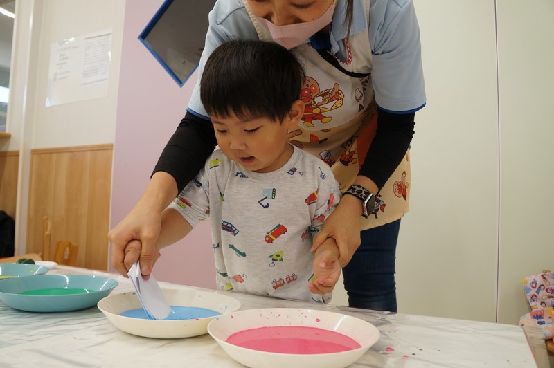 2歳児クラスは、染め紙制作をしました。