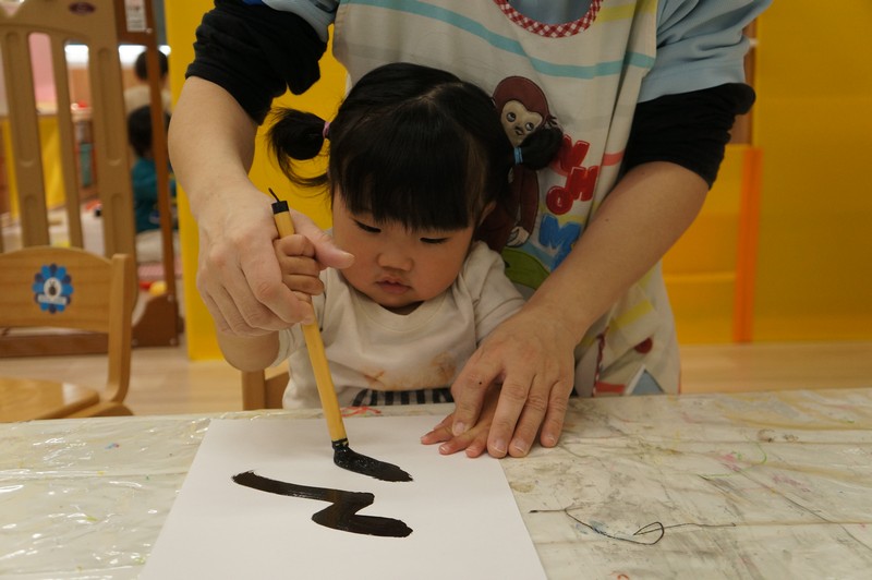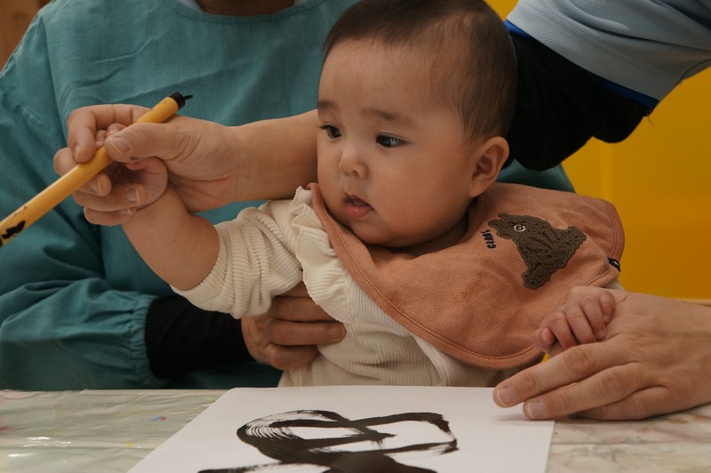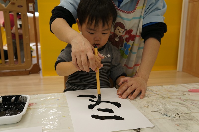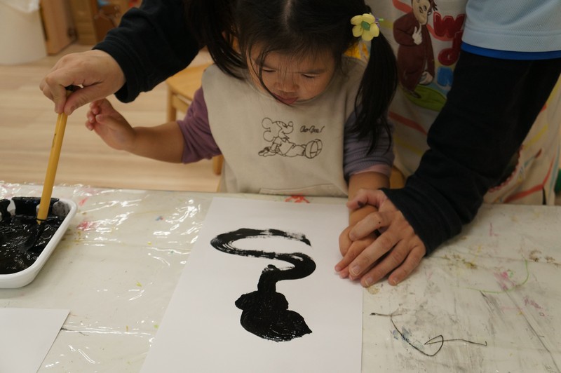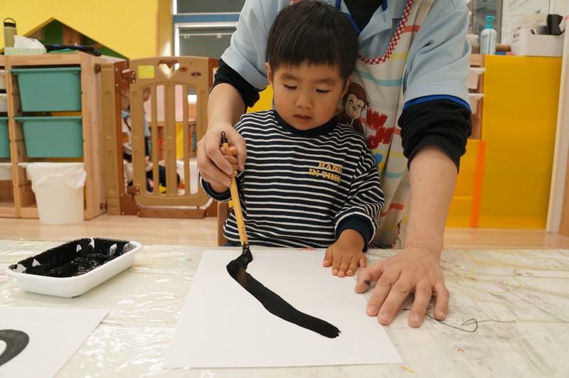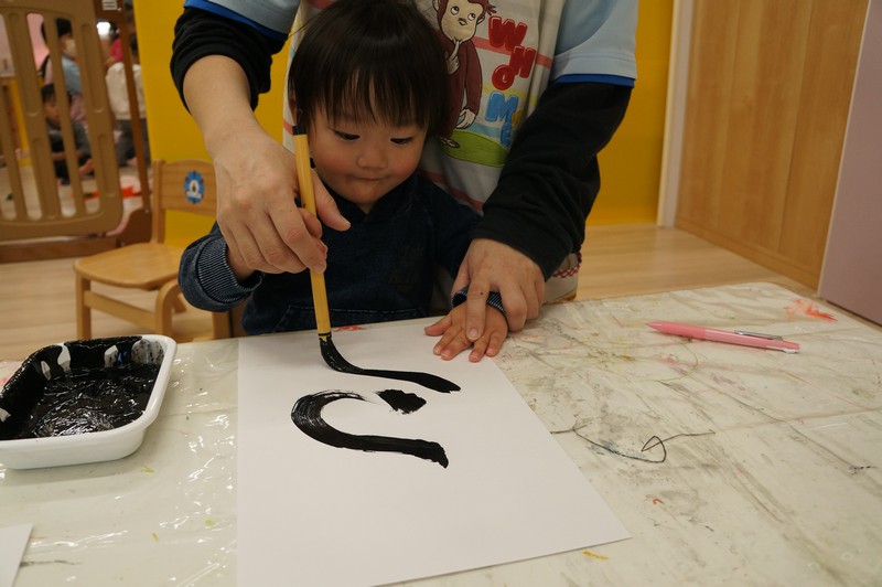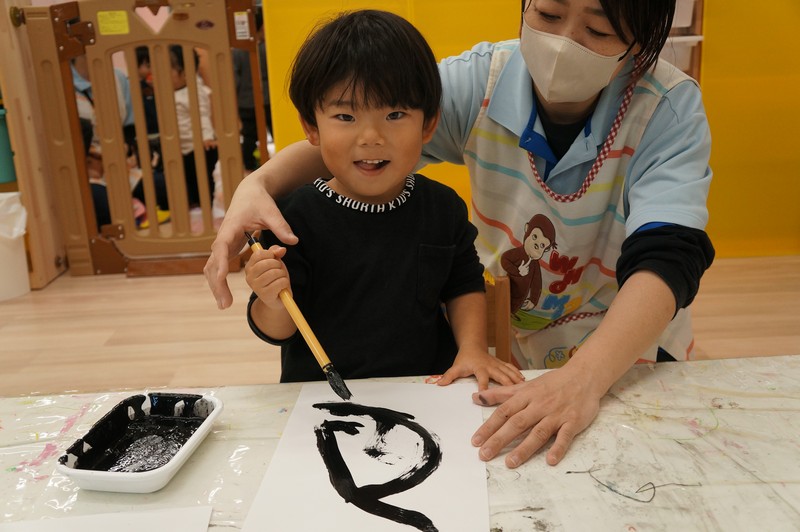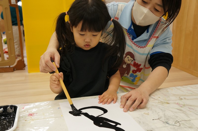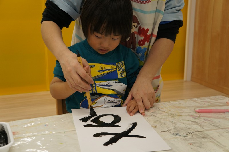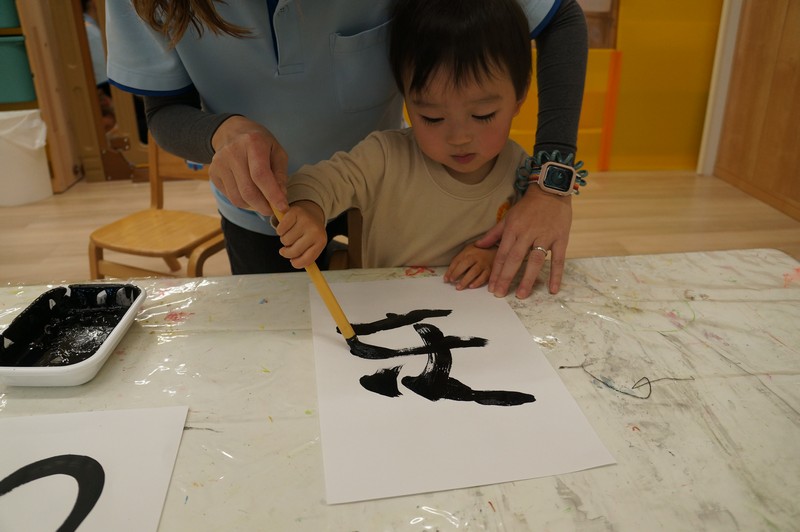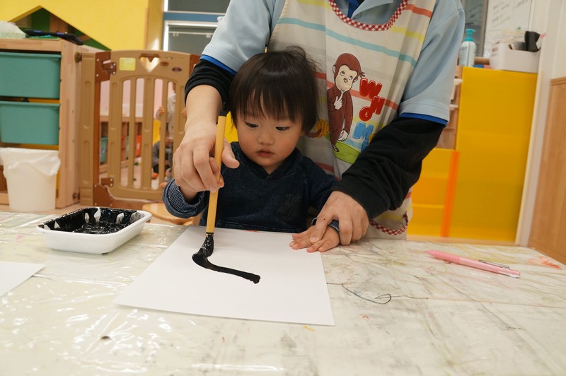 墨で…とは、いきませんが、黒い絵の具と筆で、少し早い書き初めを。