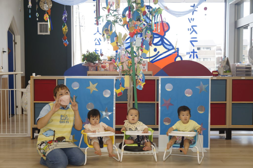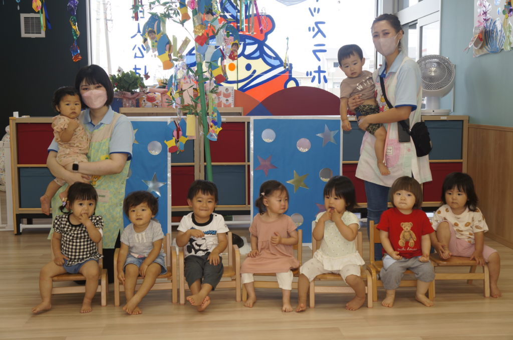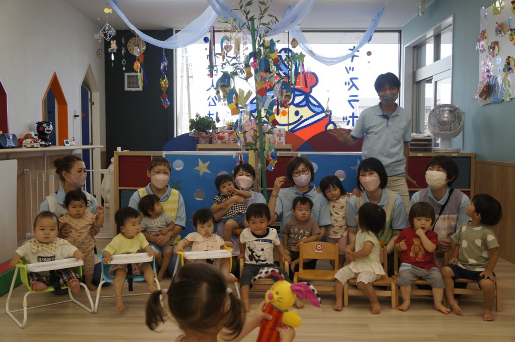7月7日は七夕。保育園では織姫と彦星のお話を聞いて、歌をうたいました。そのあと記念写真をパシャリ。給食は「星のハンバーグ」。大人気でした。本日子どもと保護者の願いを書いた笹の葉飾りをお持ち帰りします。みんなのかわいい願い事、叶うかな?