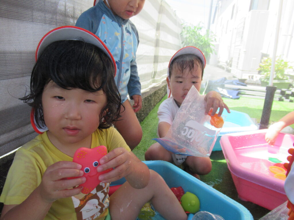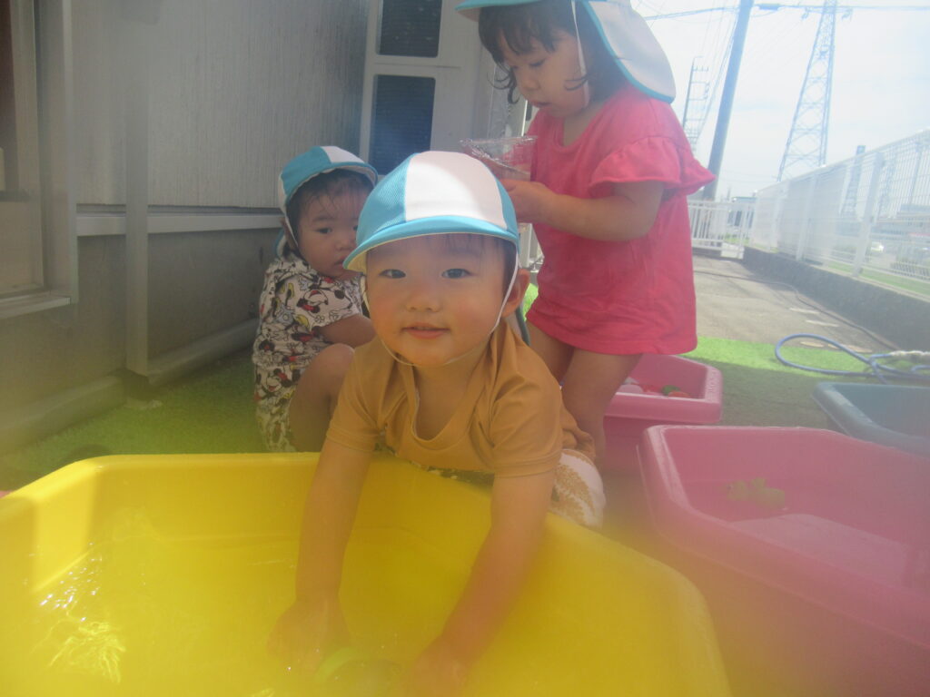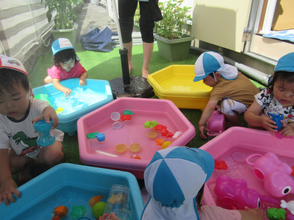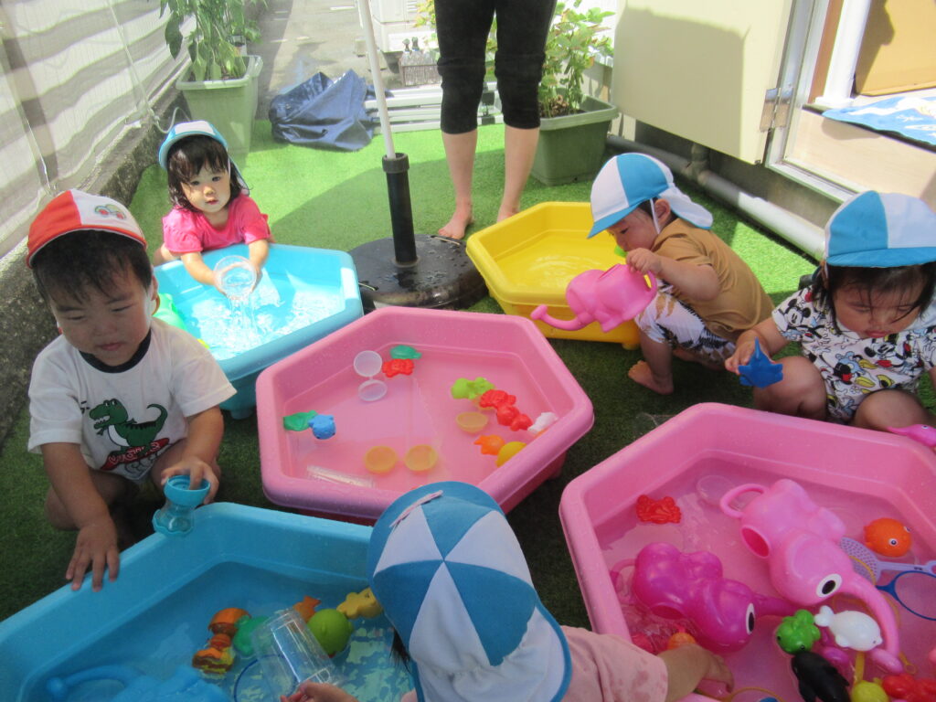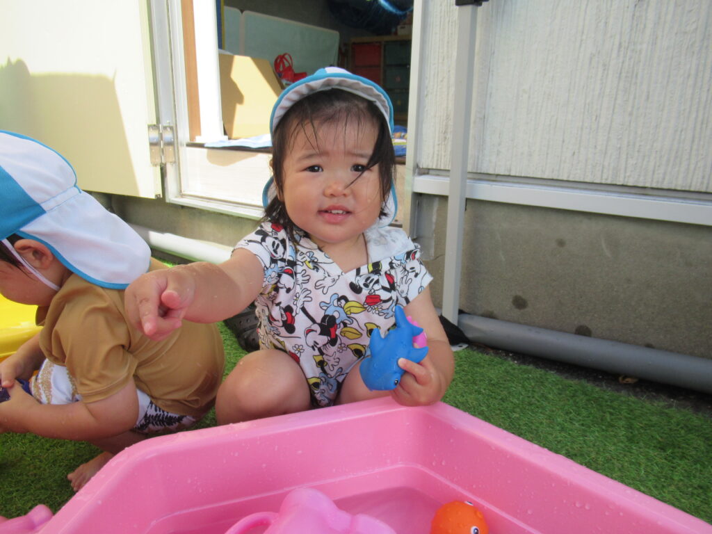 最初は水に慣れなかった子も、おもちゃであそんだり、自分から水に触れたり…