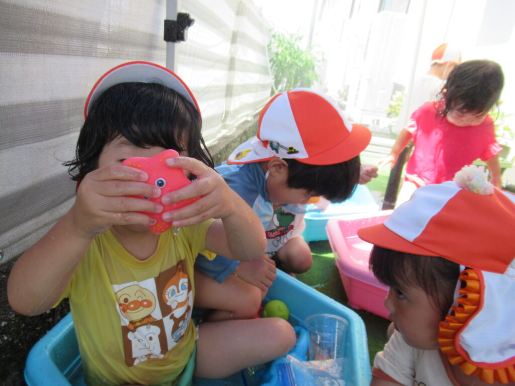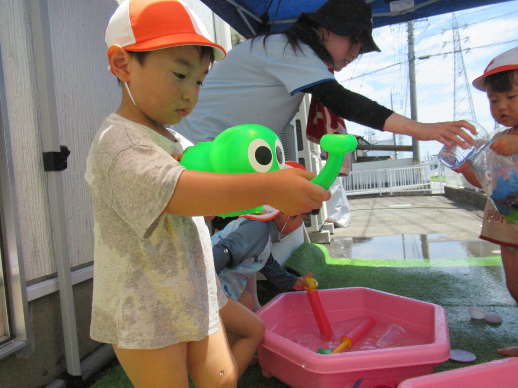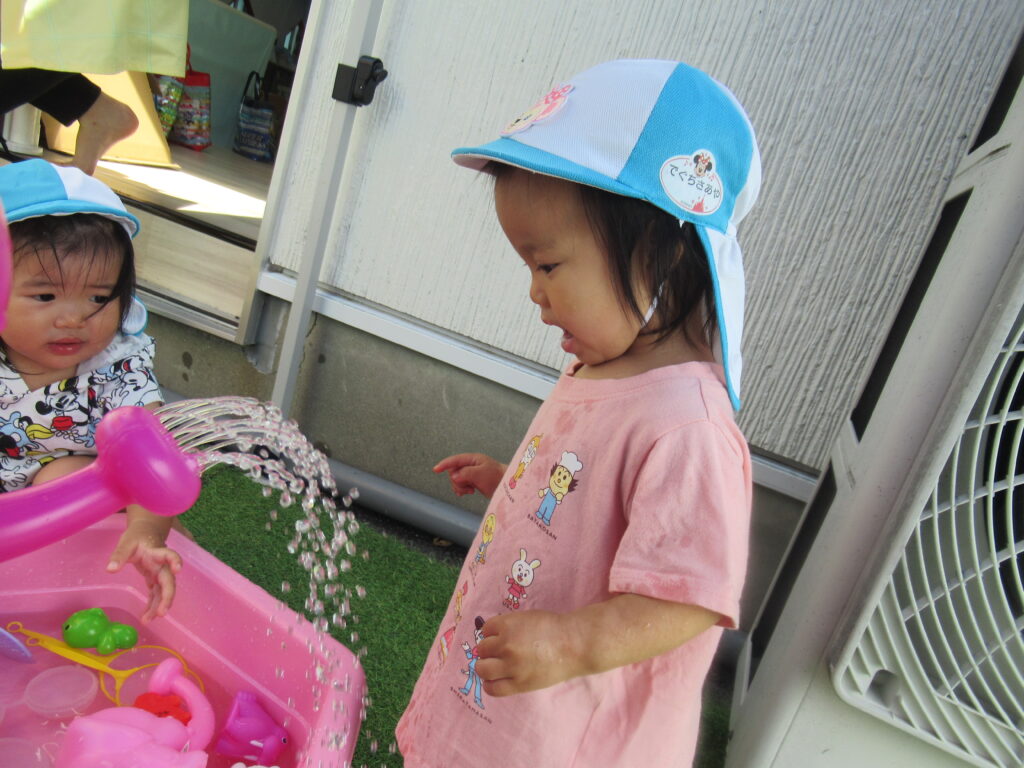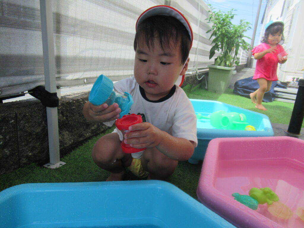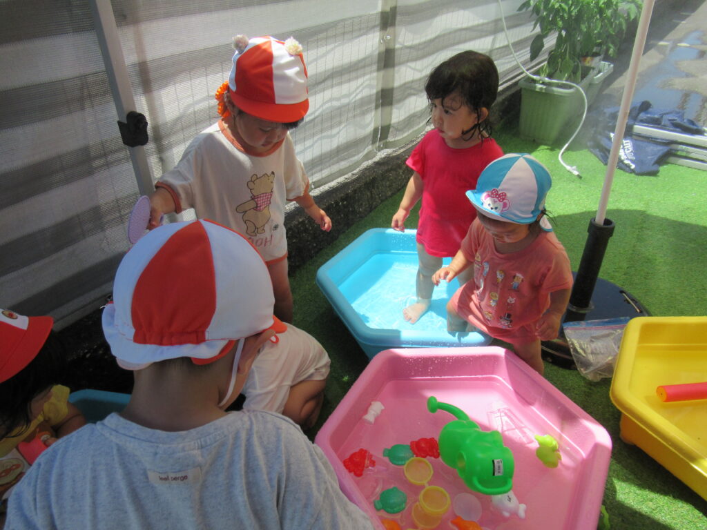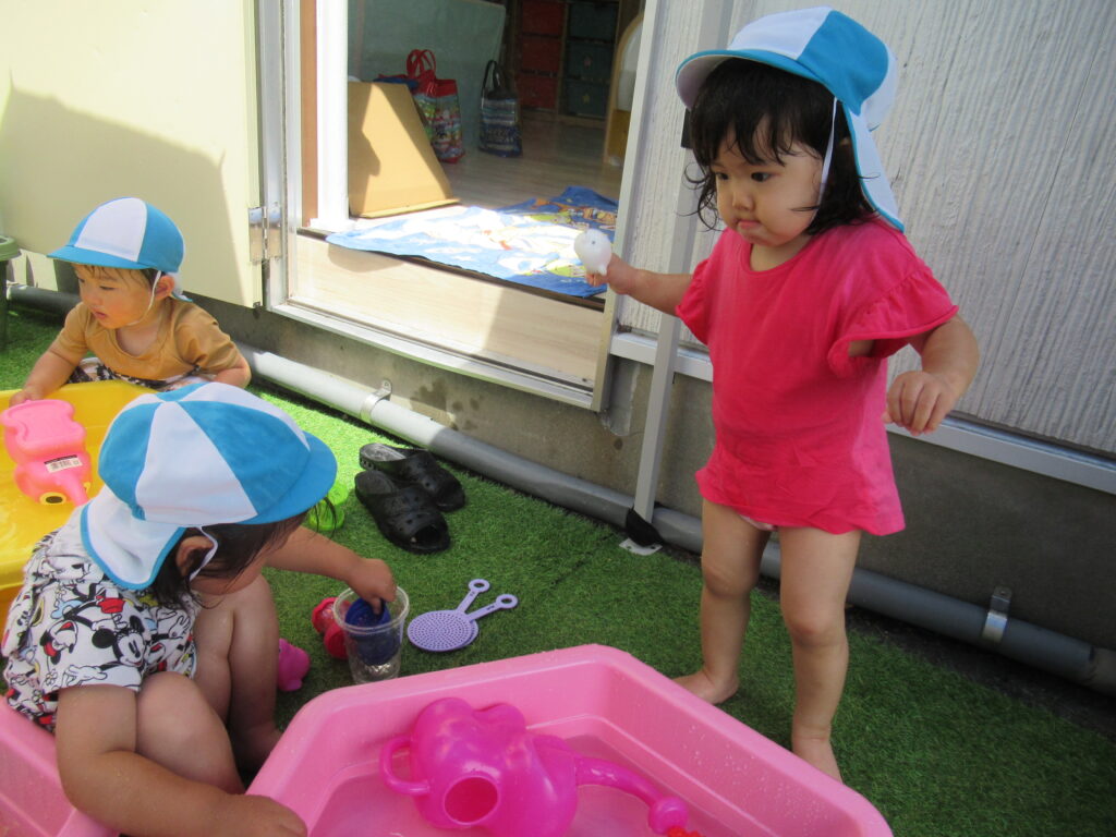 最初は水に慣れなかった子も、おもちゃであそんだり、自分から水に触れたり…