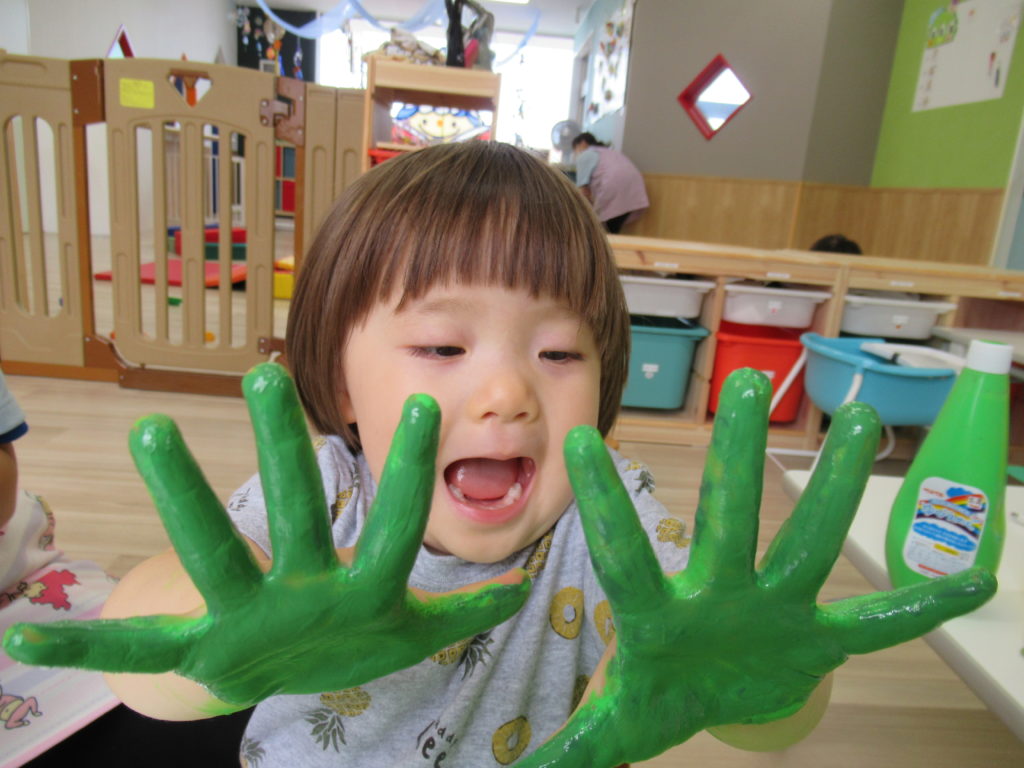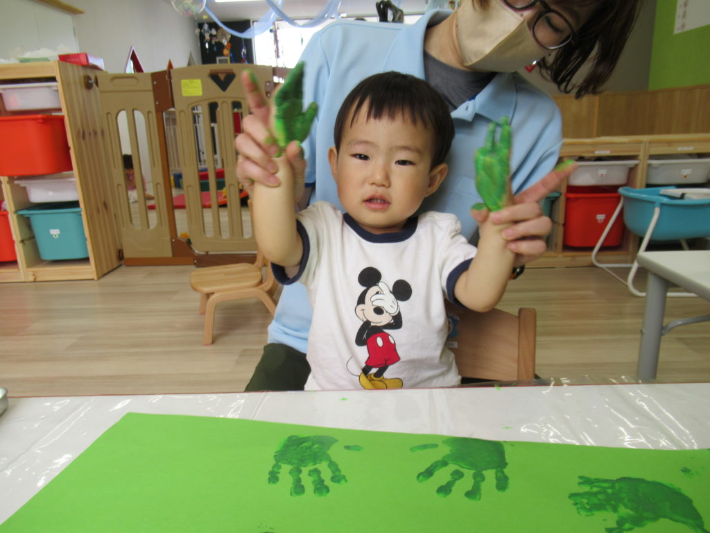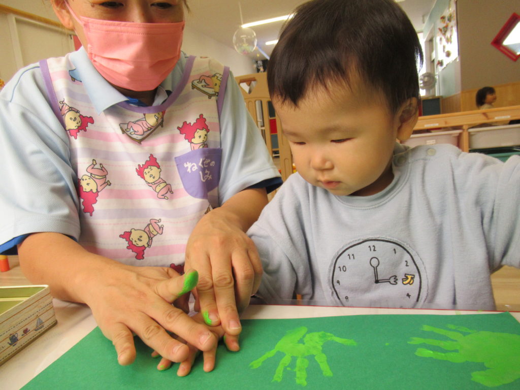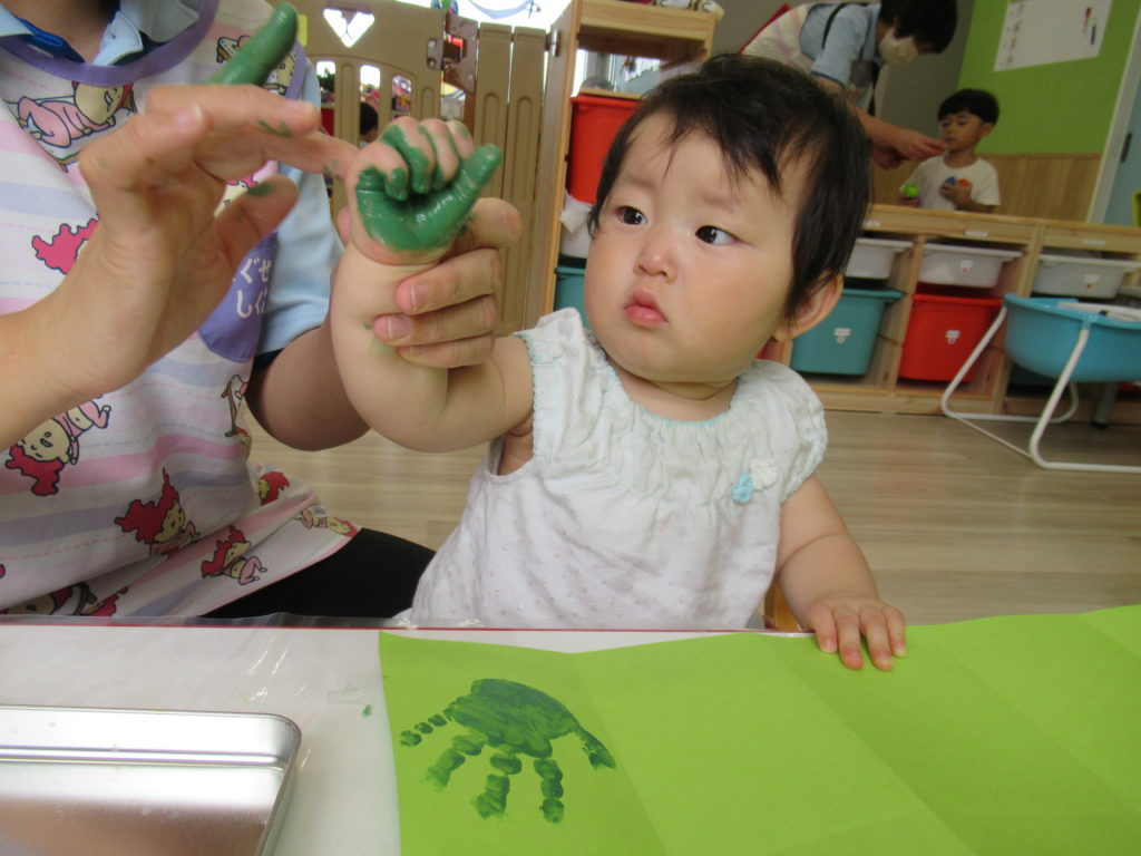 「ゆびえのぐ」を使って、感触を楽しみながらかわいい手形をとりました。手形を葉っぱ型に切り取って夏の木を制作します。とても楽しみです。