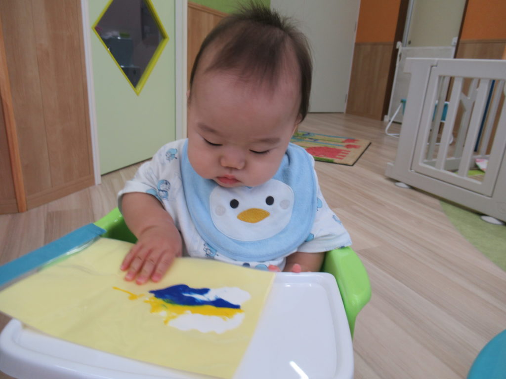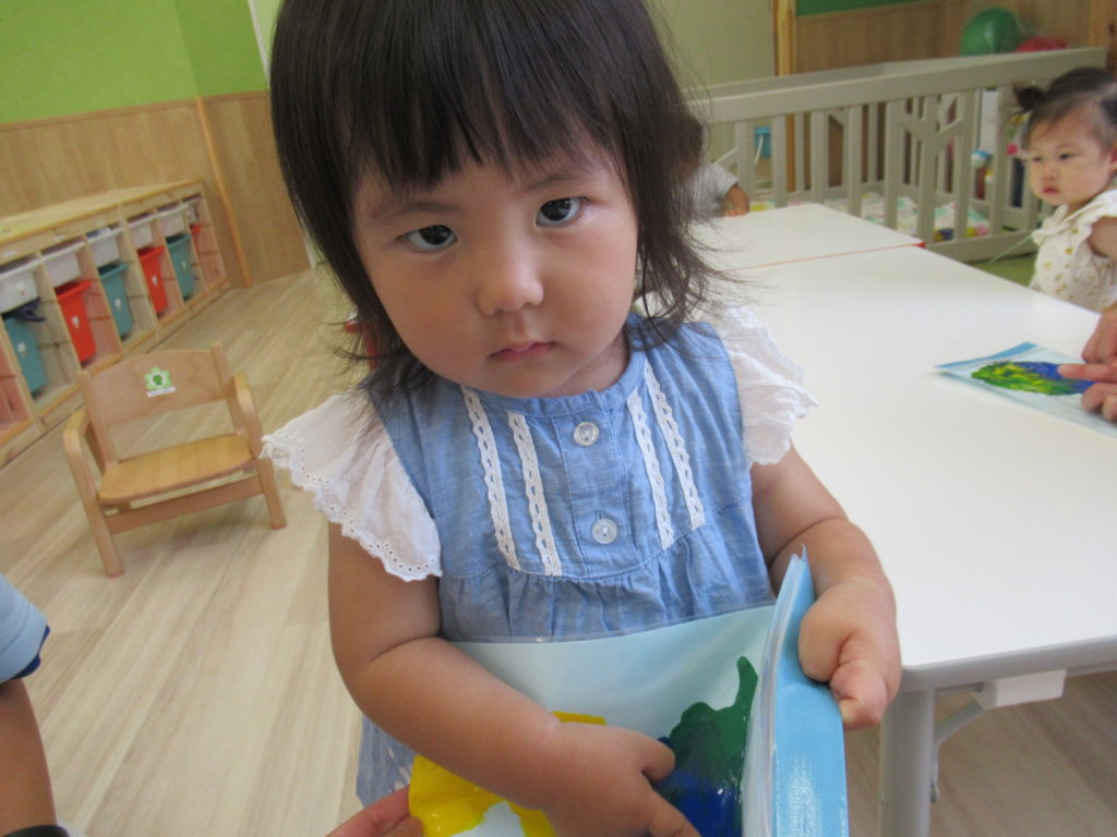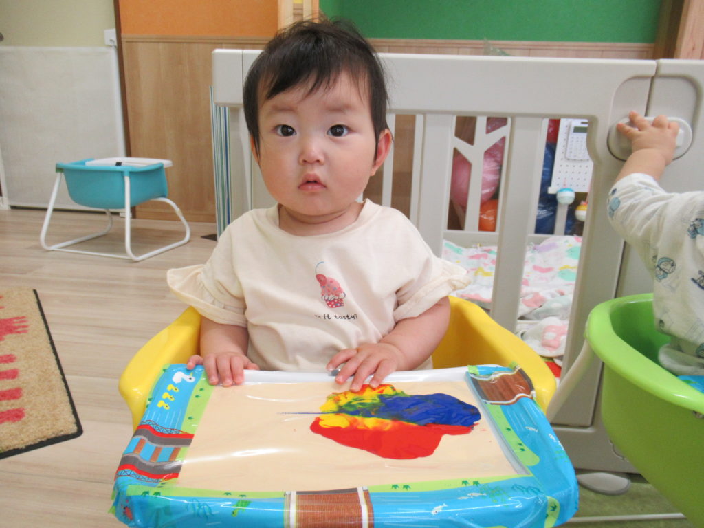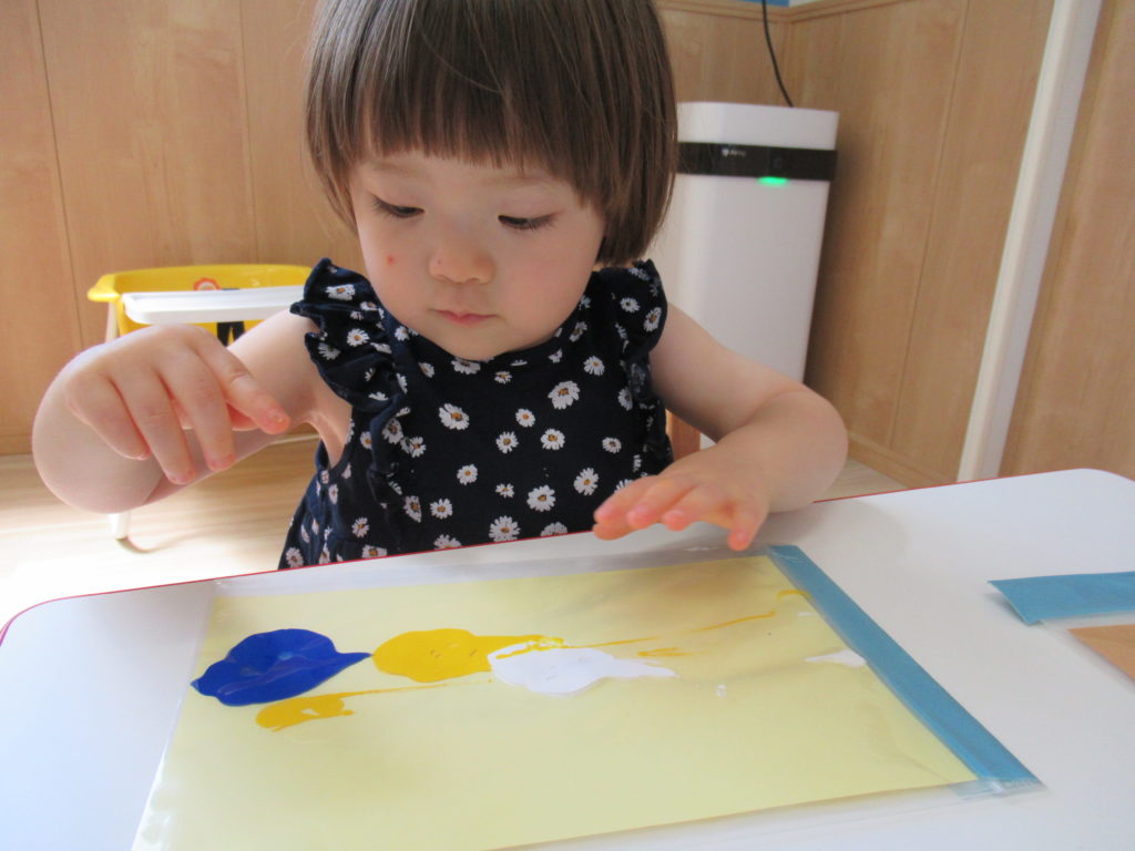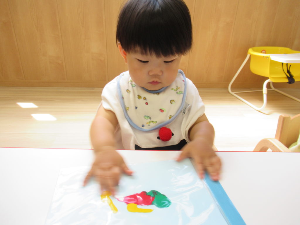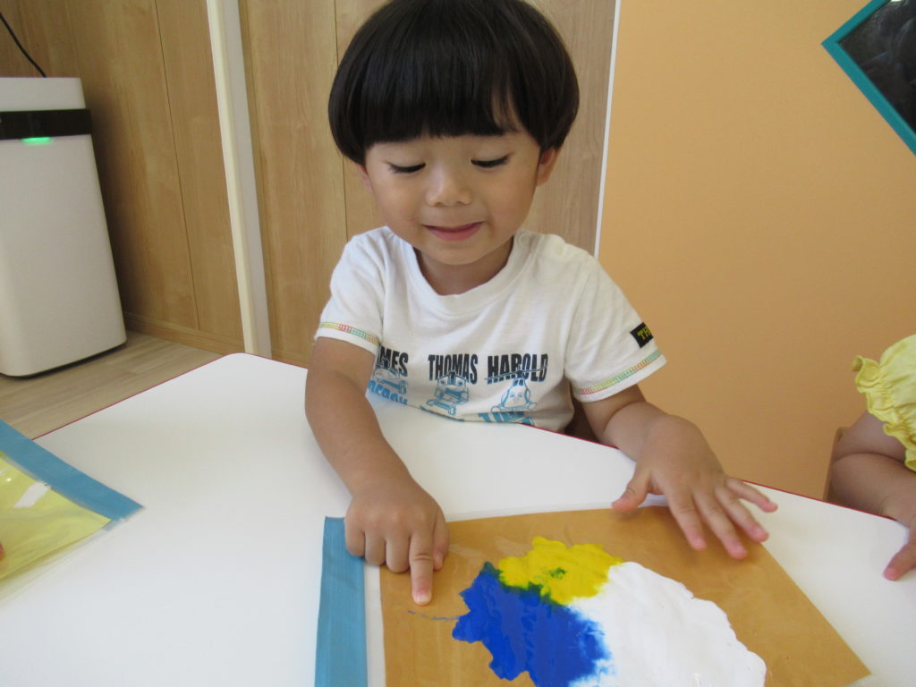 ビニール袋に絵の具を入れて、ぶにゅっとした感触を楽しむ絵の具あそびをしました。表面をさわると色々な模様ができます。個性豊かな作品を嬉しそうに見せてくれました。