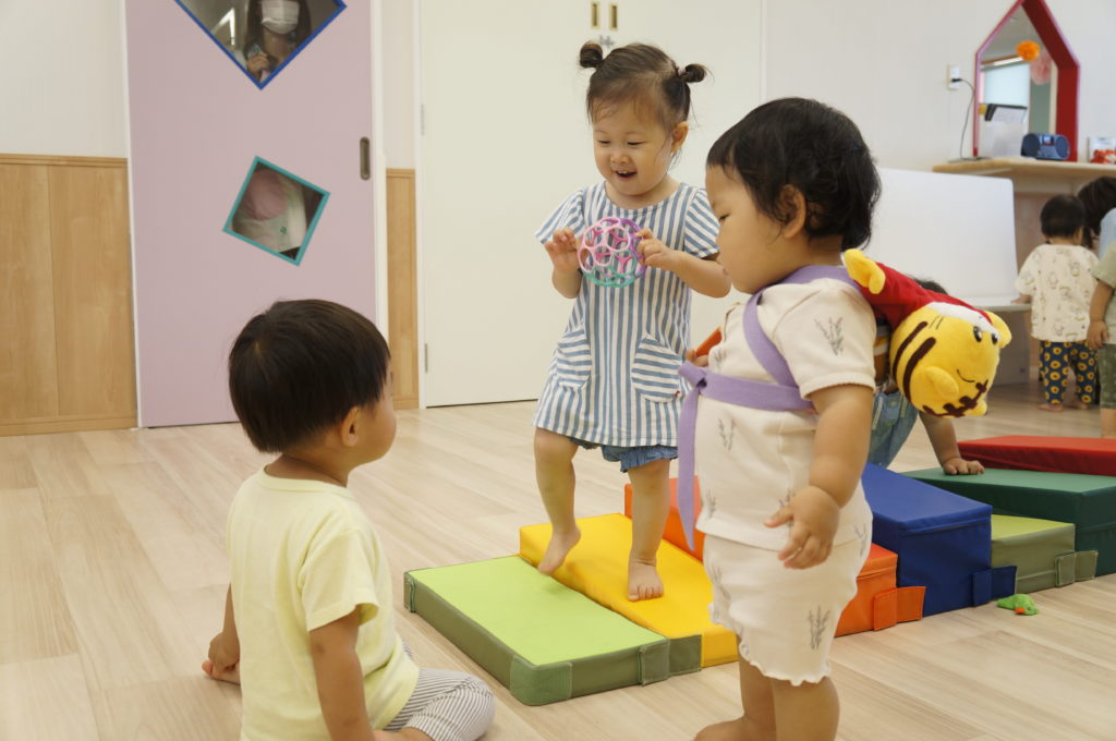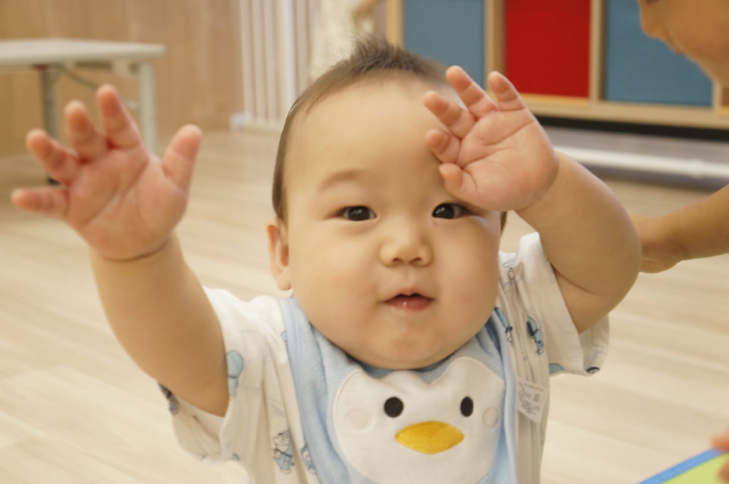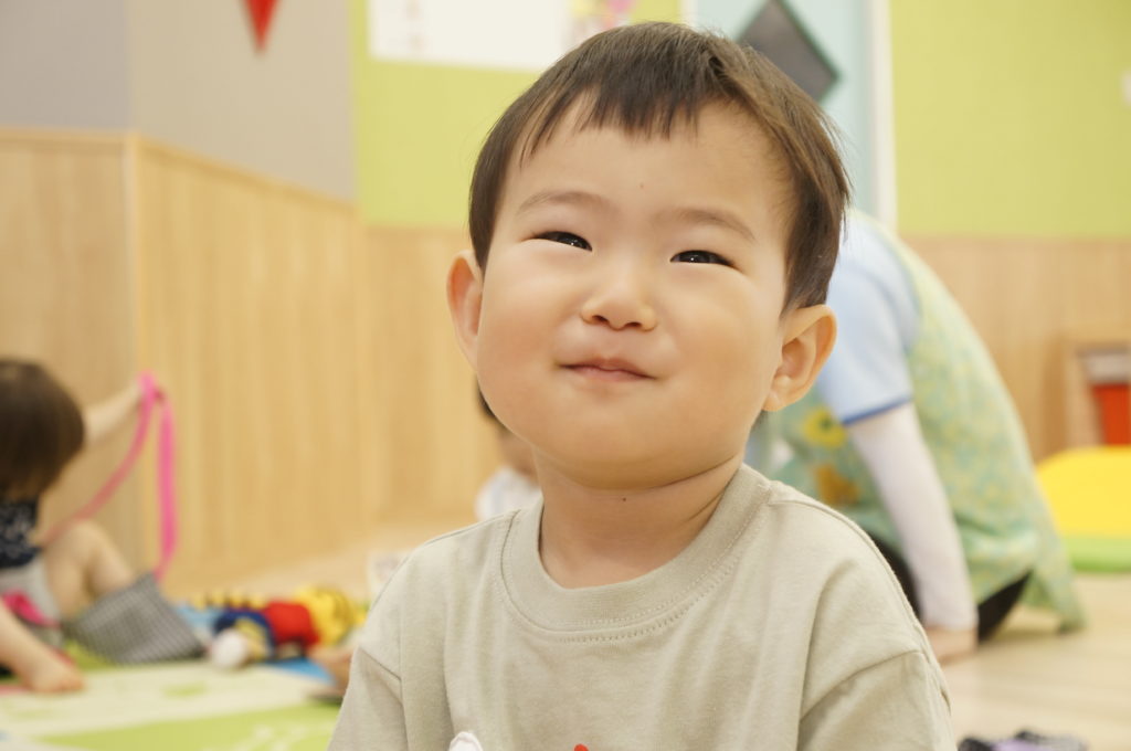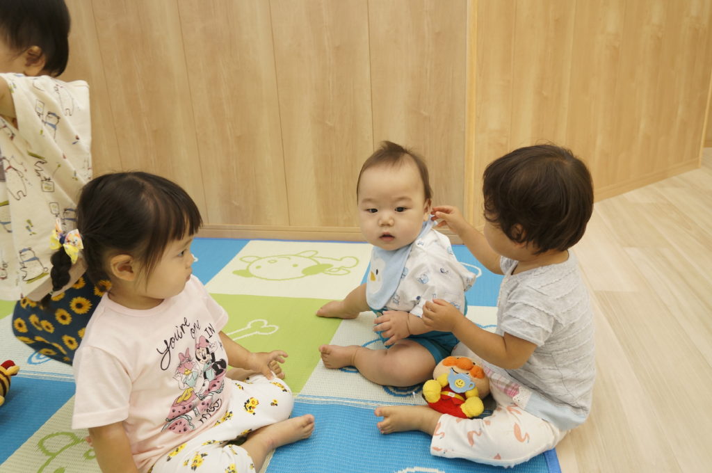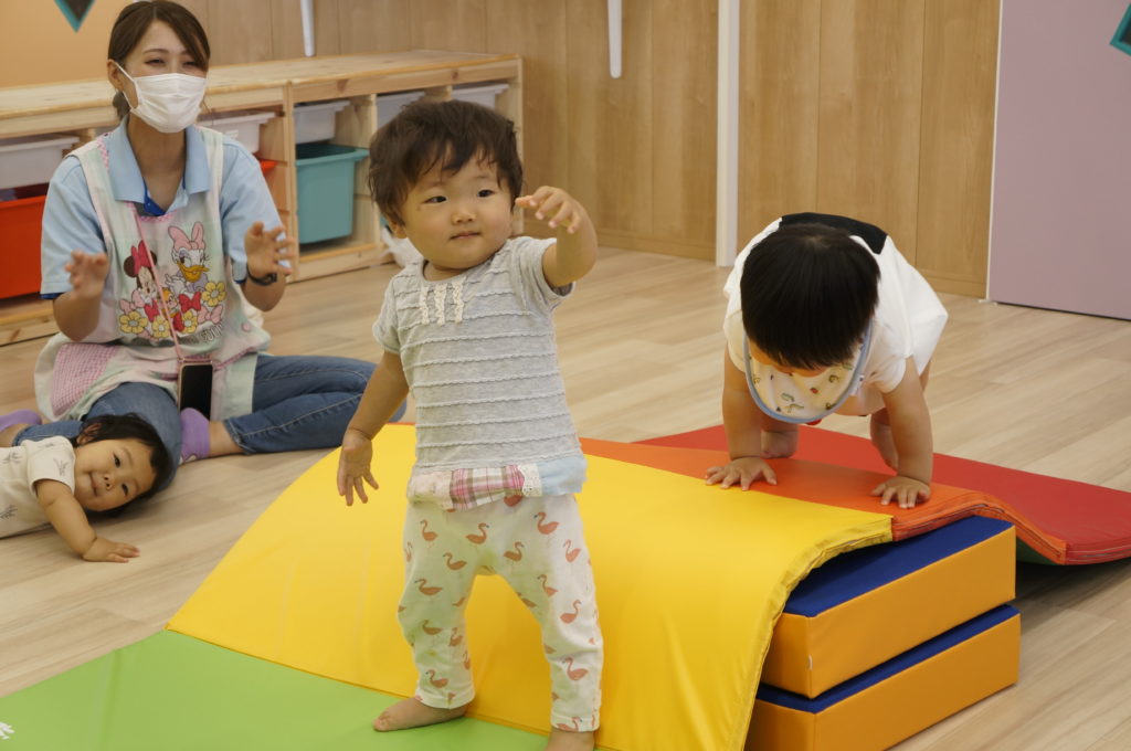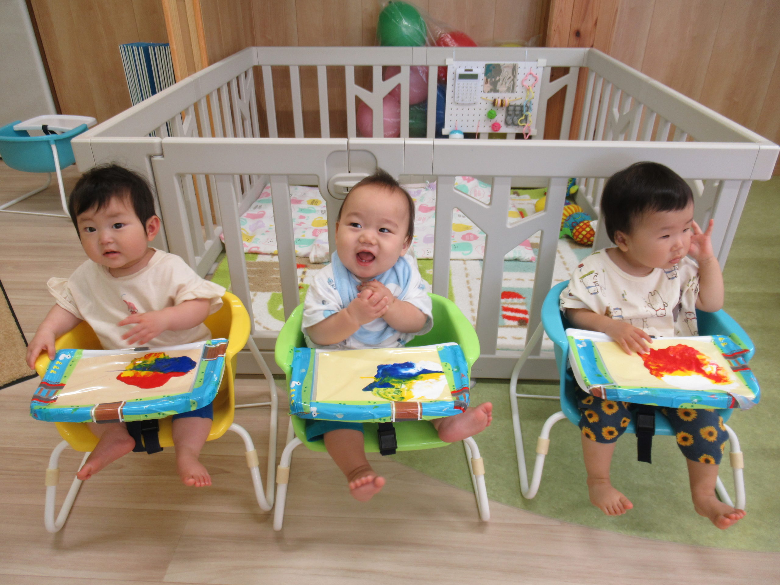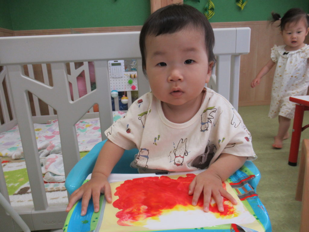 ビニール袋に絵の具を入れて、ぶにゅっとした感触を楽しむ絵の具あそびをしました。表面をさわると色々な模様ができます。個性豊かな作品を嬉しそうに見せてくれました。