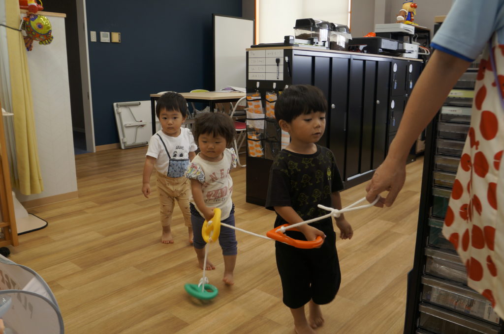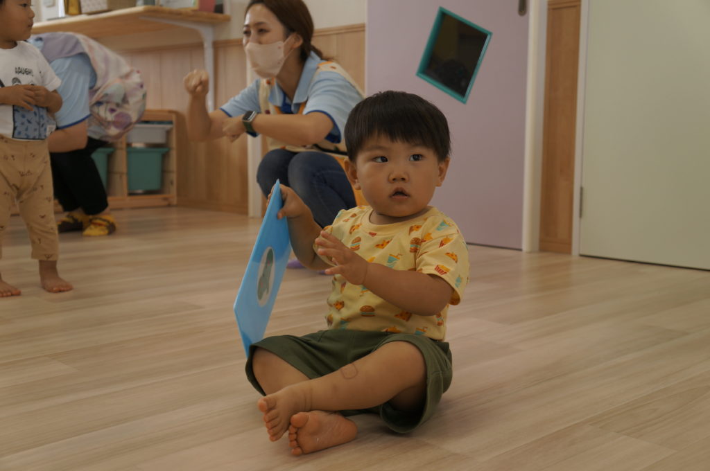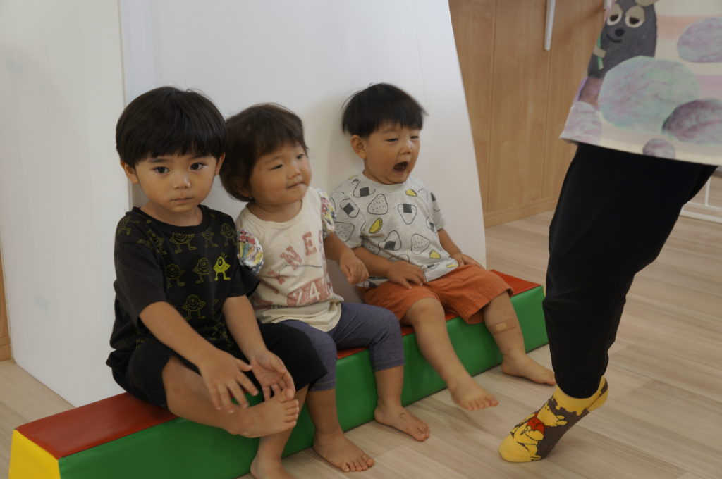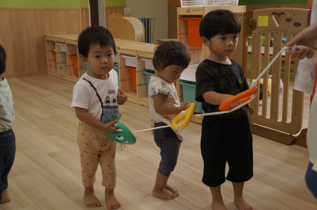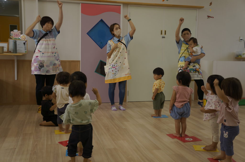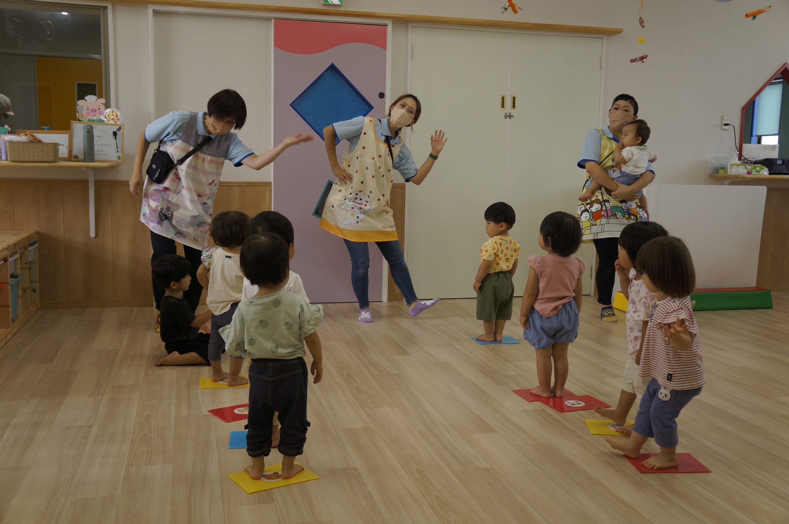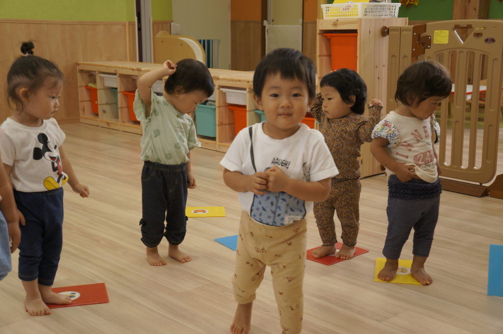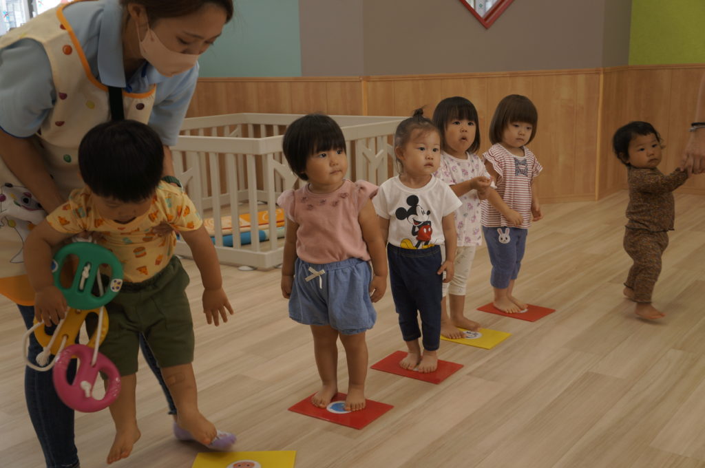 列に並ぶ練習もしています。ただ並ぶのは難しいので、自分のマークの書かれたシートの上に立っています。みんな自分のマークをちゃんと覚えているんですよ。みんなすごい!