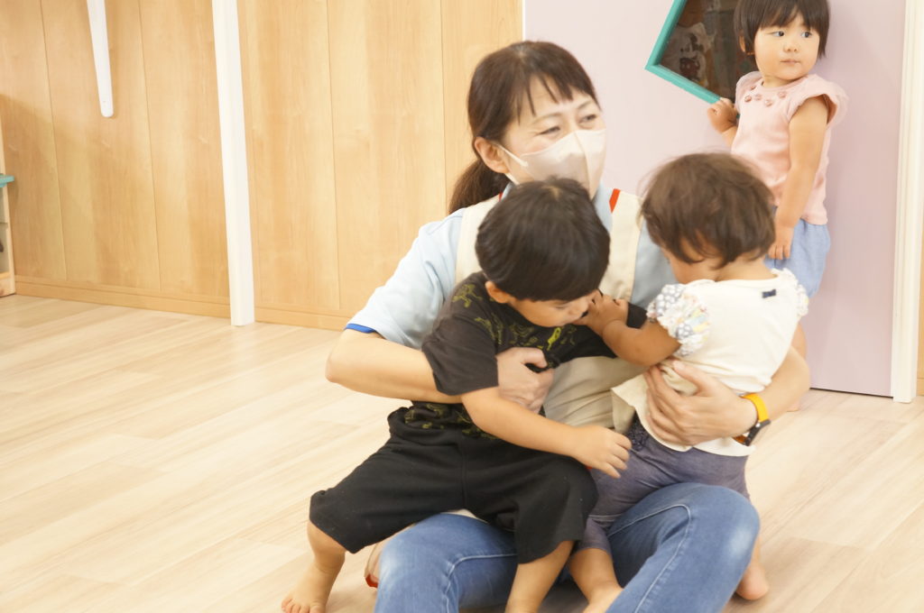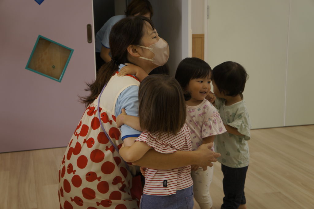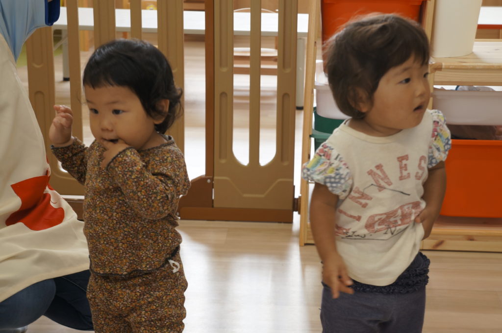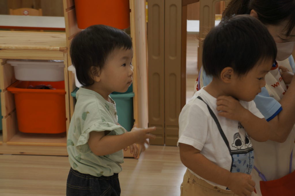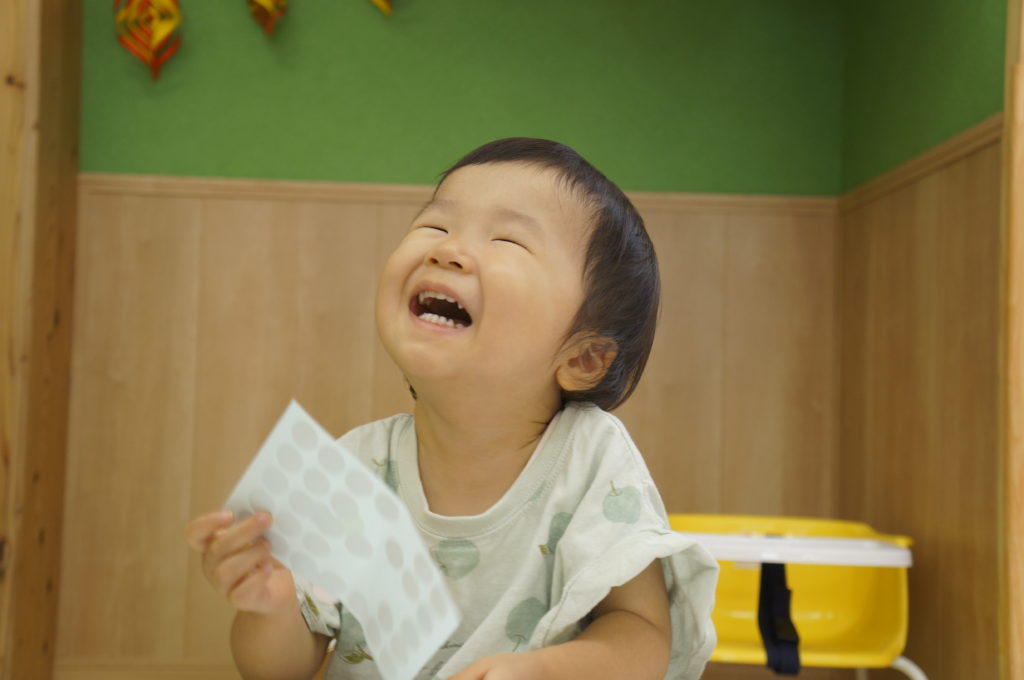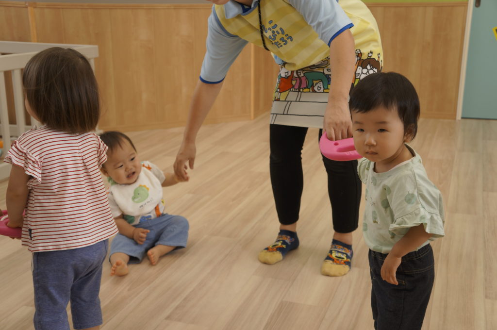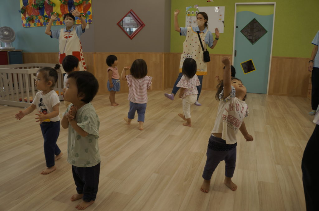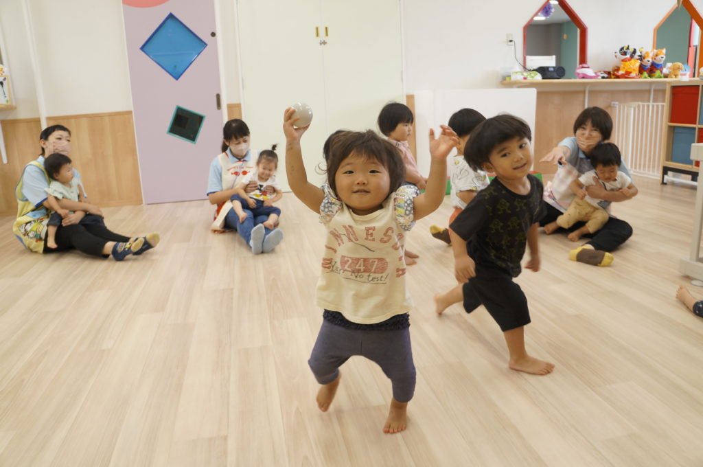 列に並ぶ練習もしています。ただ並ぶのは難しいので、自分のマークの書かれたシートの上に立っています。みんな自分のマークをちゃんと覚えているんですよ。みんなすごい!