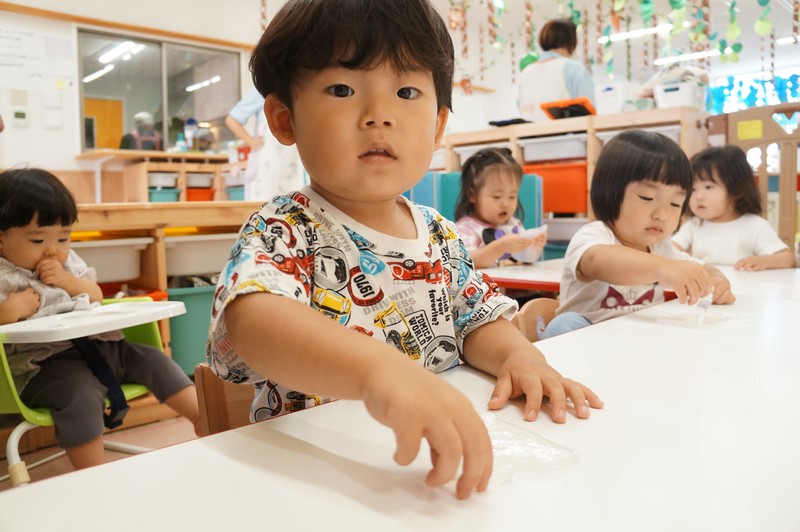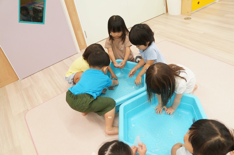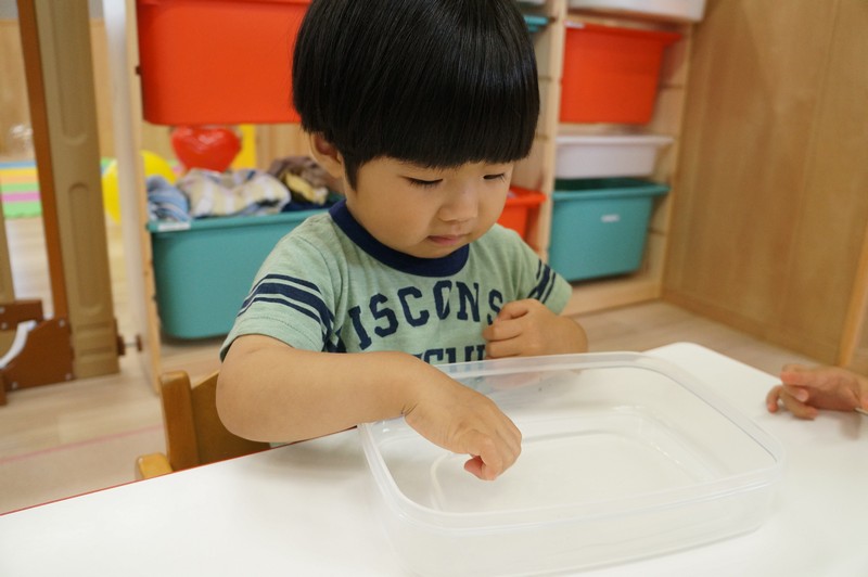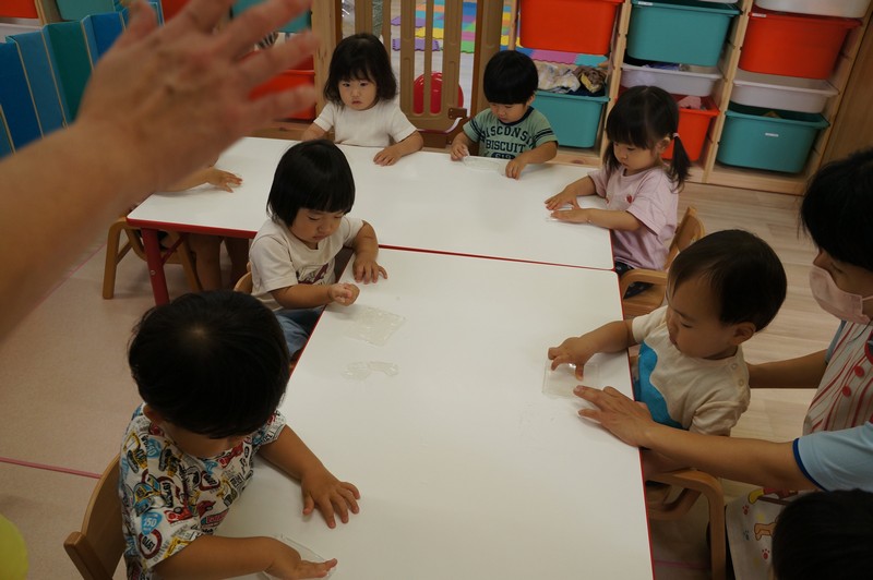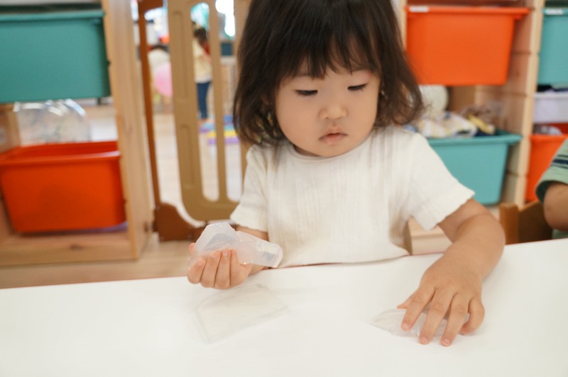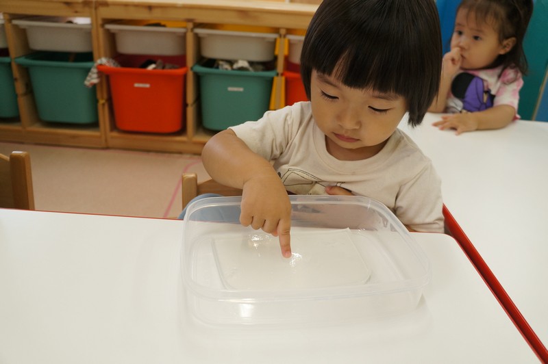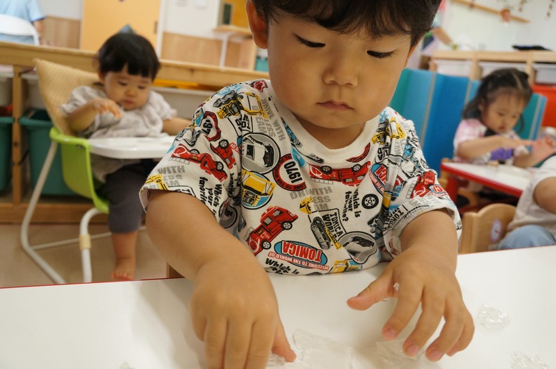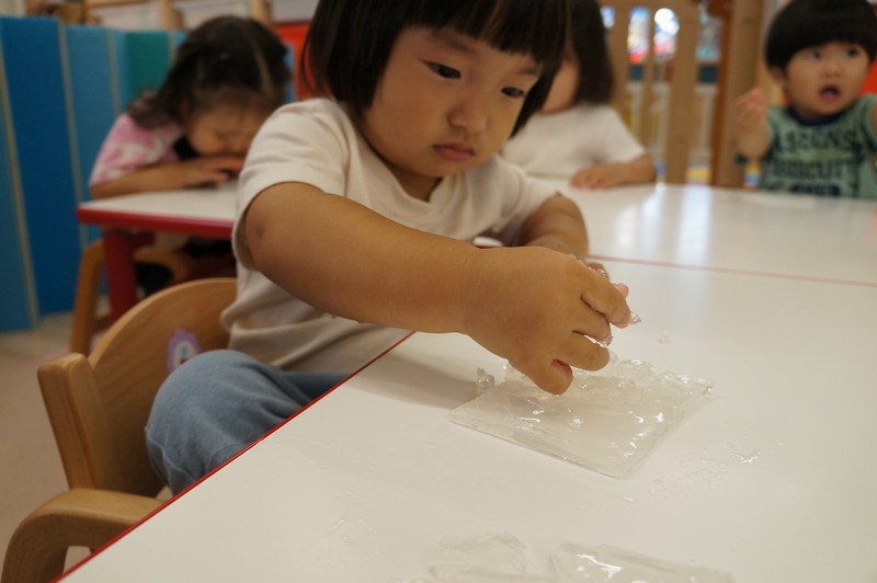 寒天ならではの触り心地や見た目、音などを感じ、五感を養います。