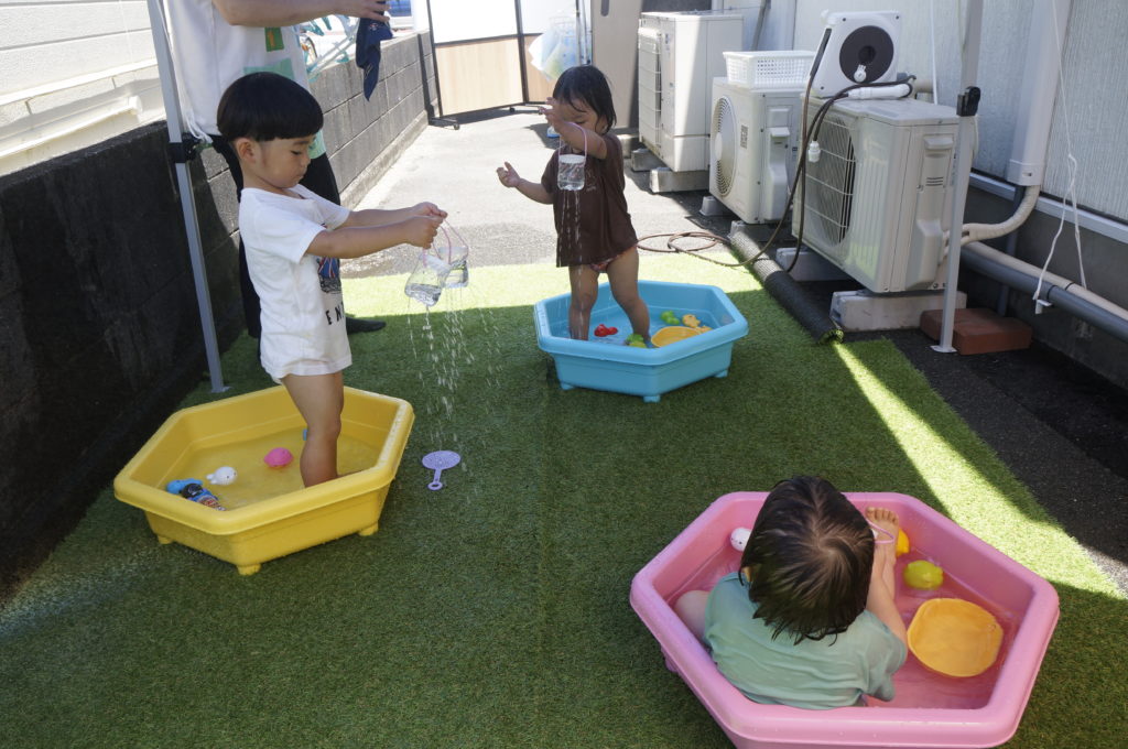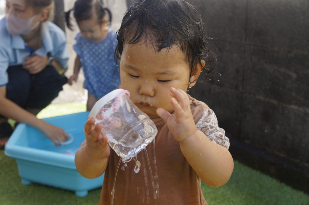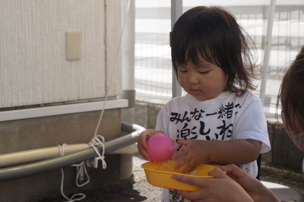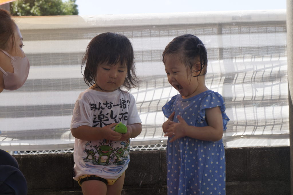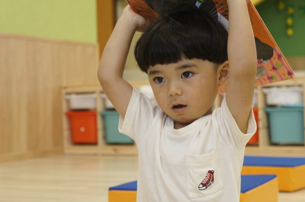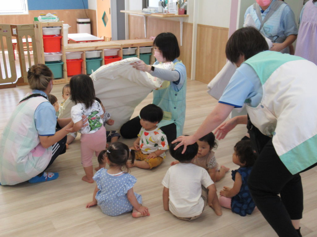 今日は地震の避難訓練をしました。「地震です!みんな集まって!」の声で一か所に集まり頭を守るために上から布団をかけました。揺れが収まってから避難車に乗って駐車場まで移動しましたが、驚いて泣き出す子は一人もおらずスムーズに避難ができました。災害が起こらないことが一番ですが、いざという時子どもたちの命を守るために避難訓練を続けていきます。