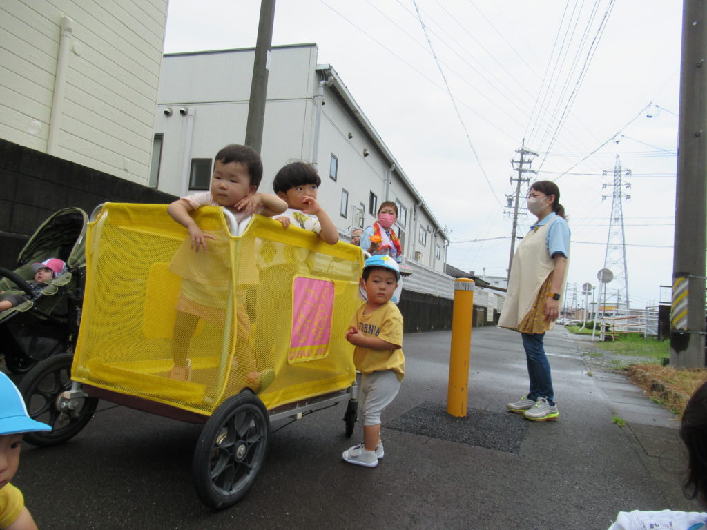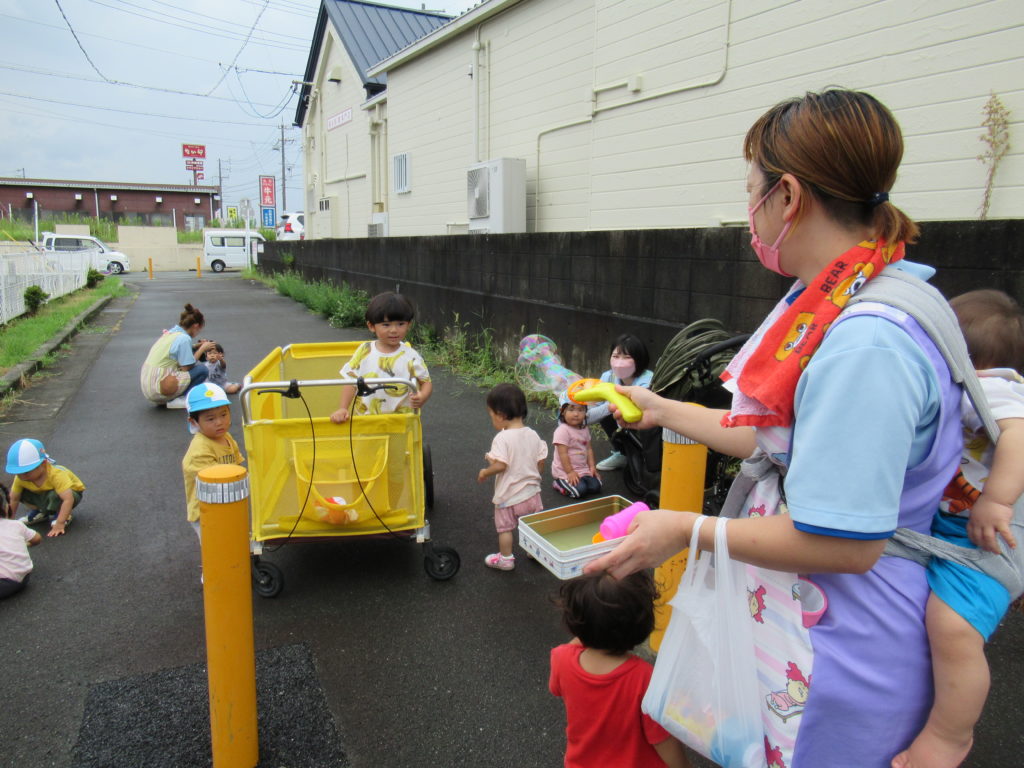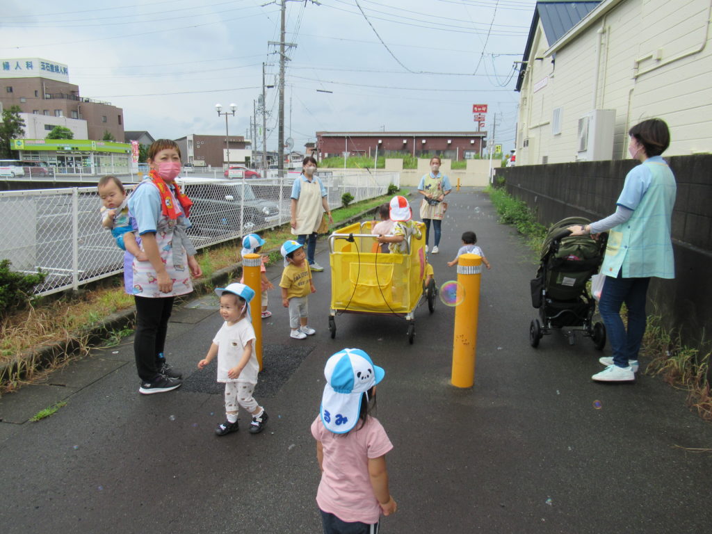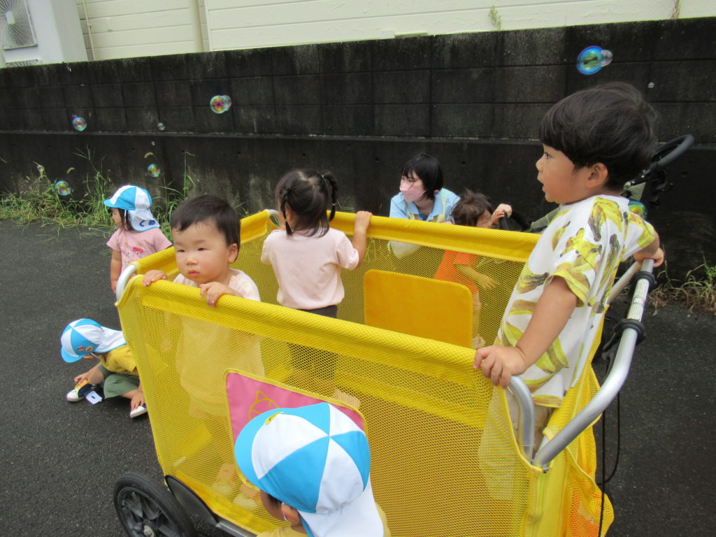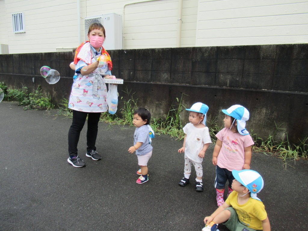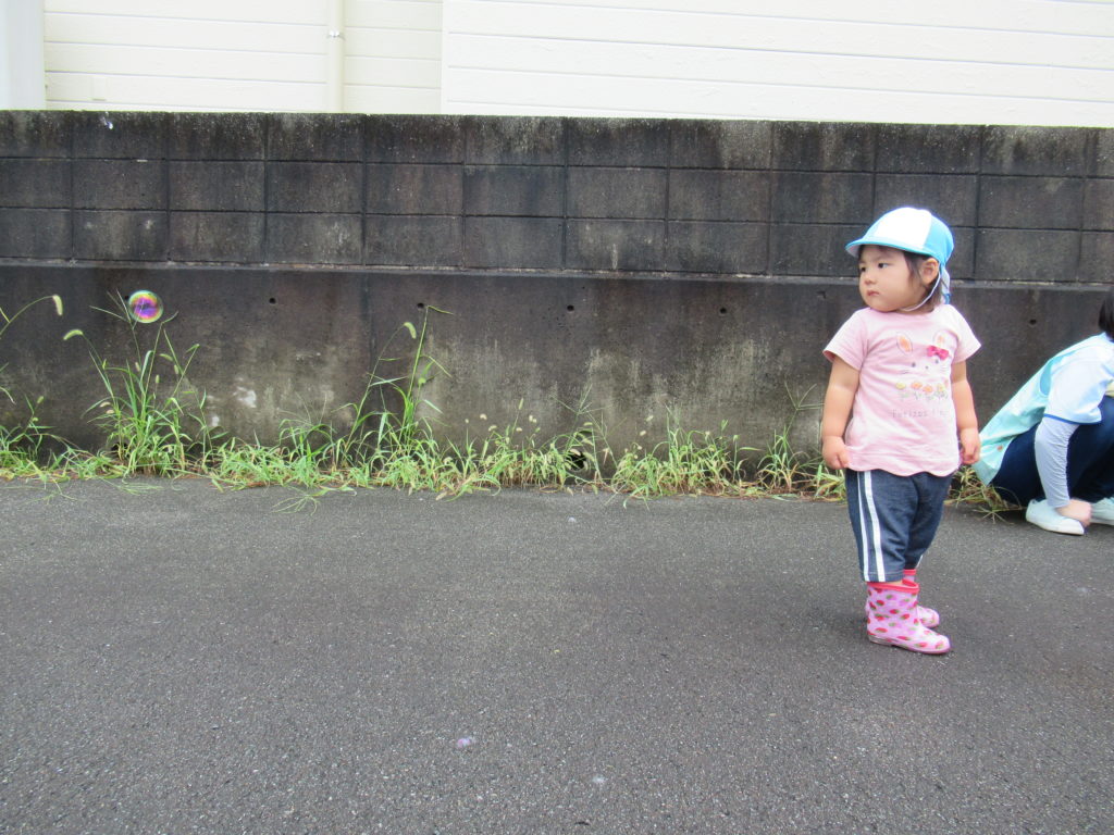 今朝は大雨でしたね。とてもお外には行けないと思いましたが、雨が止んで涼しかったのでお外でしゃぼん玉をしました。